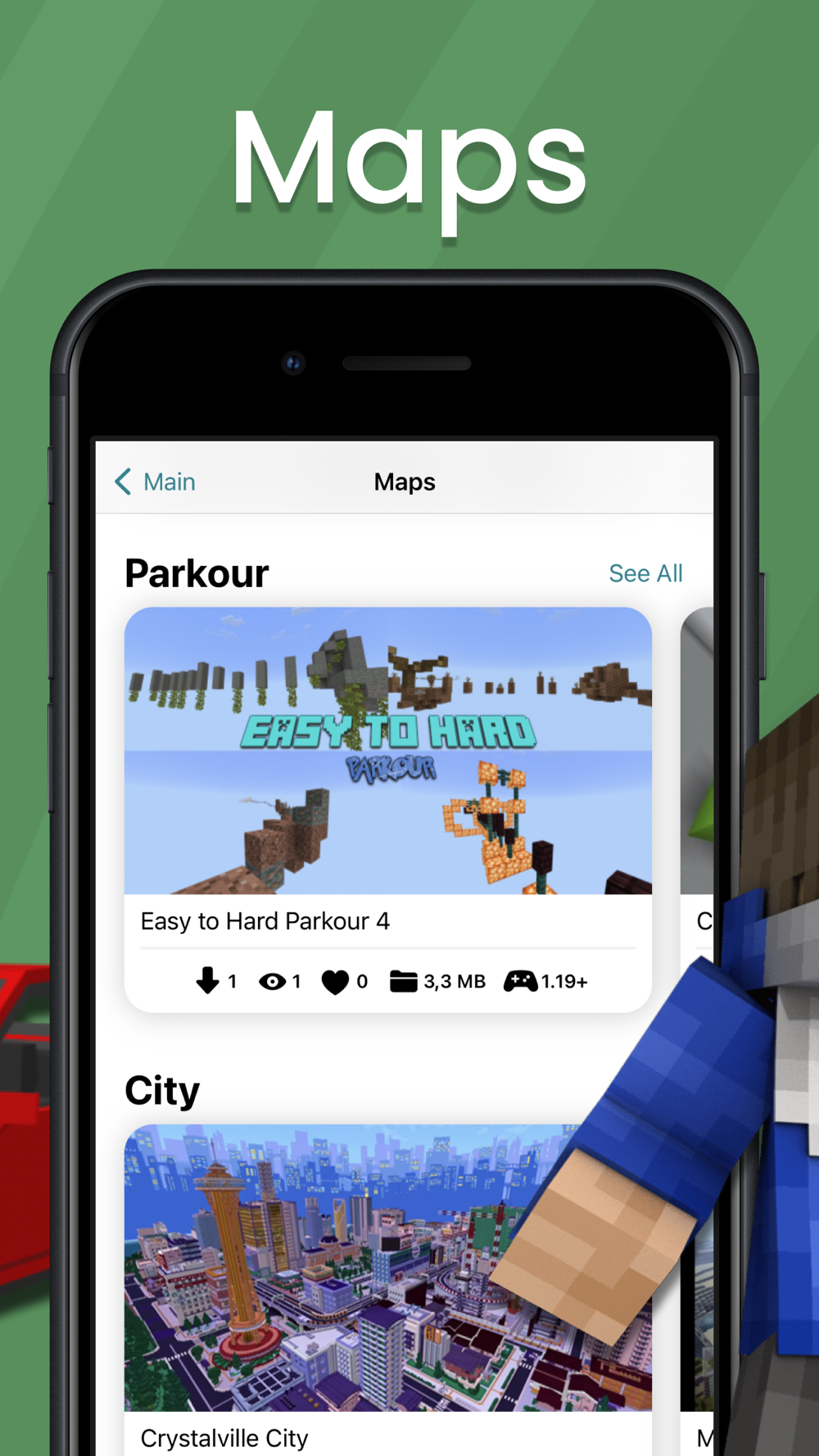 Install mods for Minecraft Pocket Edition! The application will provide you with a large collection of mods, addons, maps, skins, textures, seeds, and shaders for Minecraft PE.