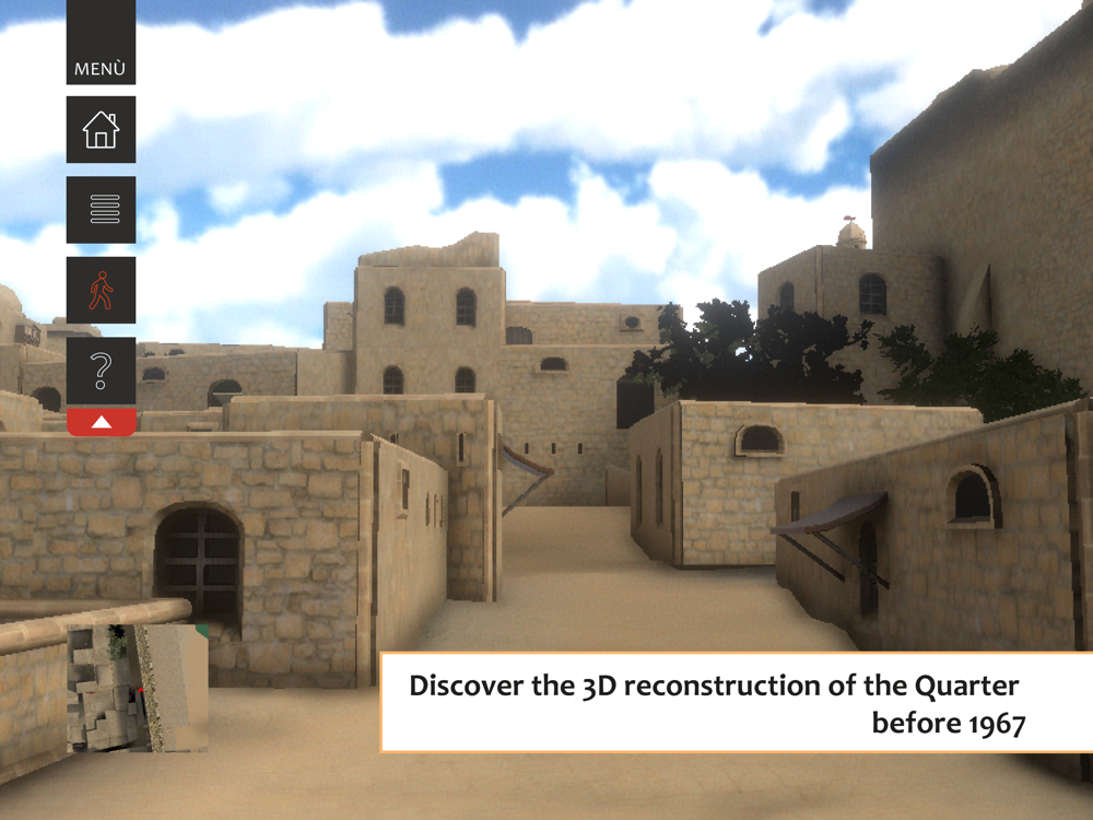The application provides a Maghrebi Quarter virtual tour, reconstructed through 3d modeling techniques, allowing the user to discover places of interest through historical notes.