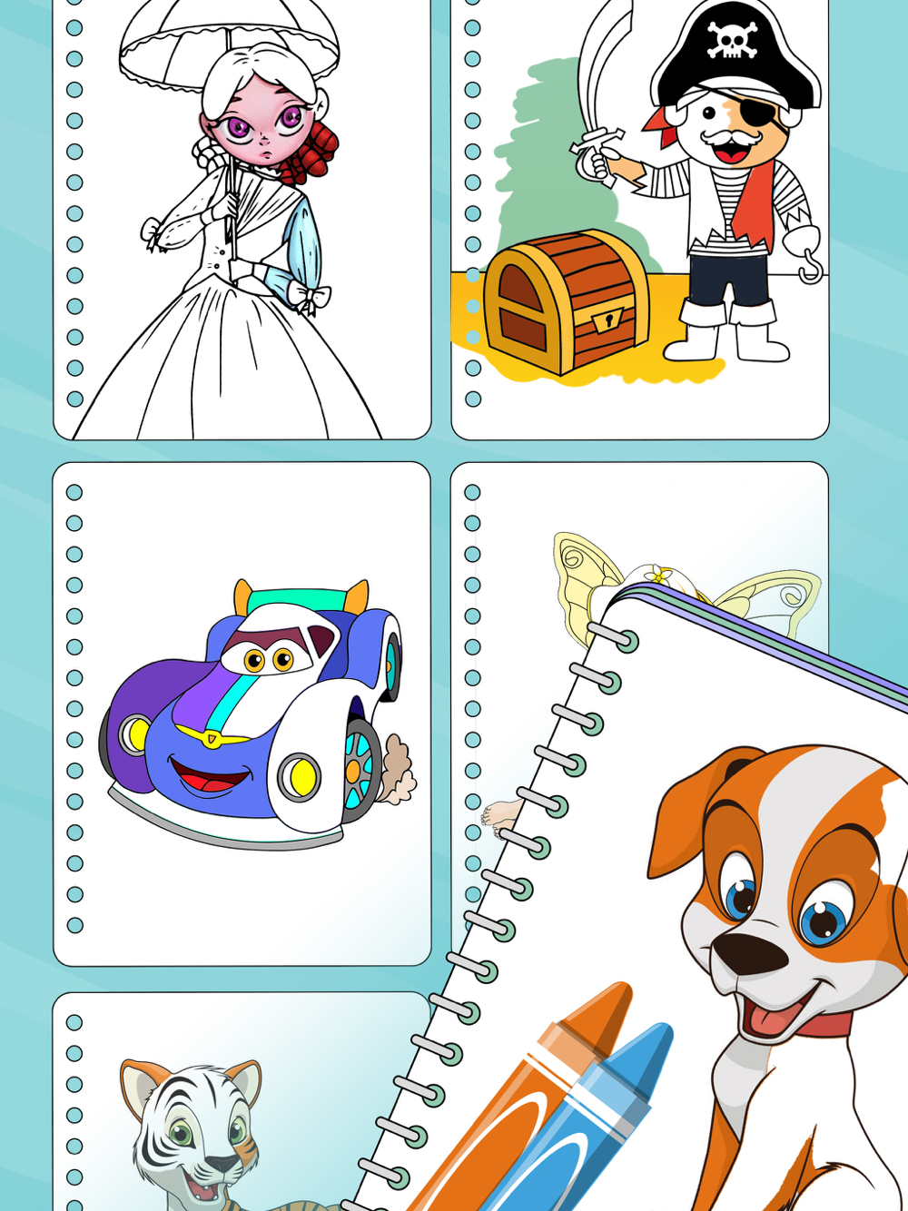 Enjoy different categories of our coloring book game. Discover amazing drawings of animals, princesses, pirates, cars, fairies and emojis.