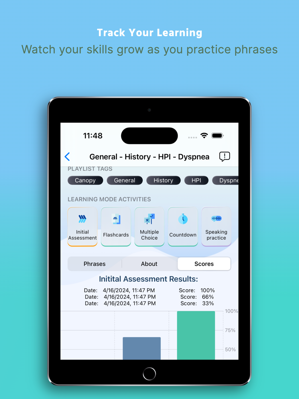 * Create and tag playlists according to Canopy’s Essential Skills for Bilingual Healthcare Communication to practice the phrases you use most.