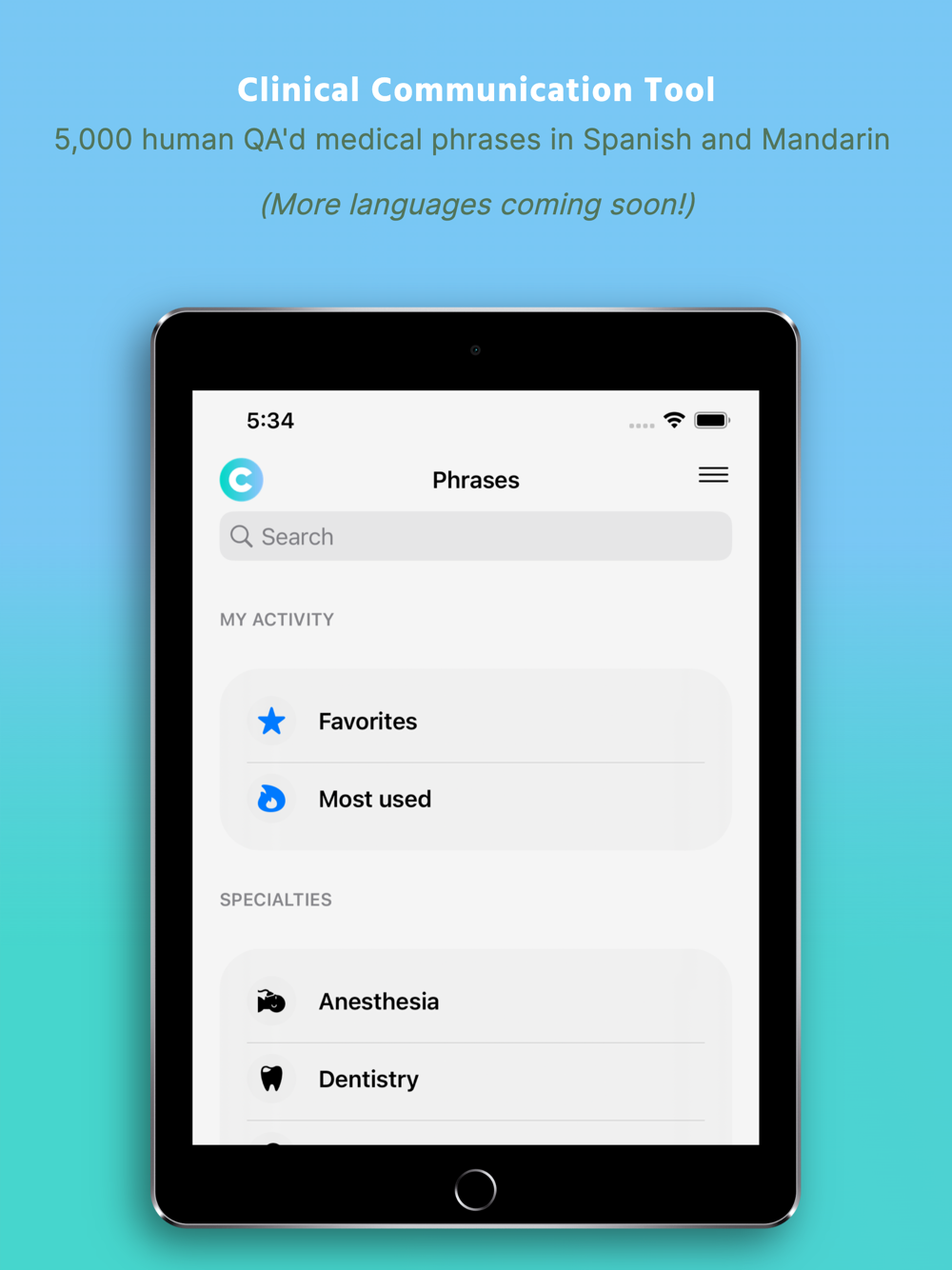 * Phrases in over 10 specialties, including Emergency Medicine, General Surgery, Pediatrics, and more.