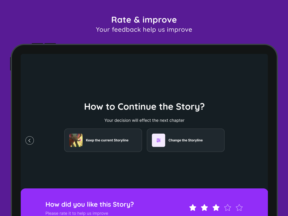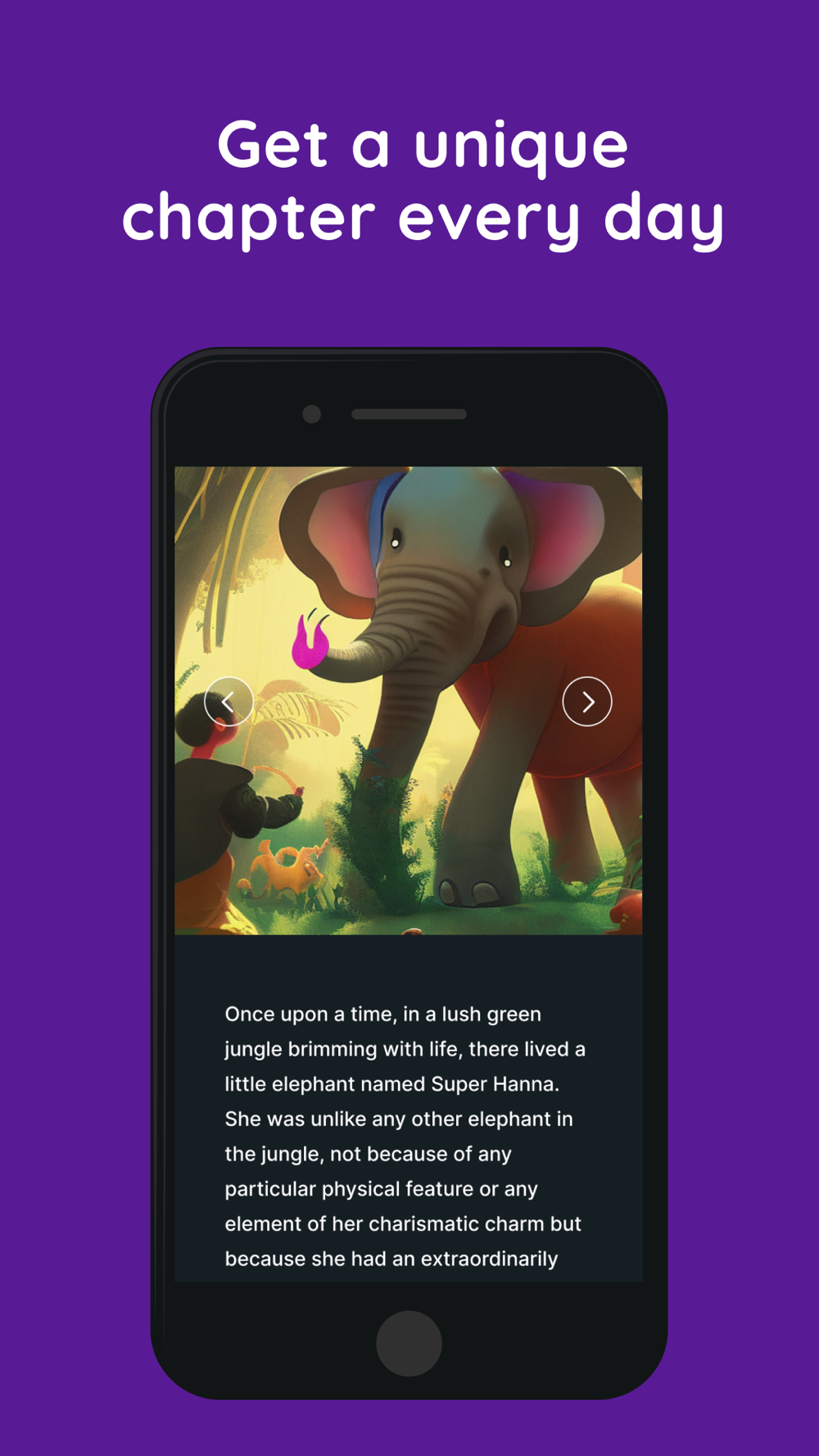 Create a kid profile, select a topic and visual style and the app will create a new chapter in the story, every day. You can adapt the storyline whenever you want and your changes will affect the next chapter.