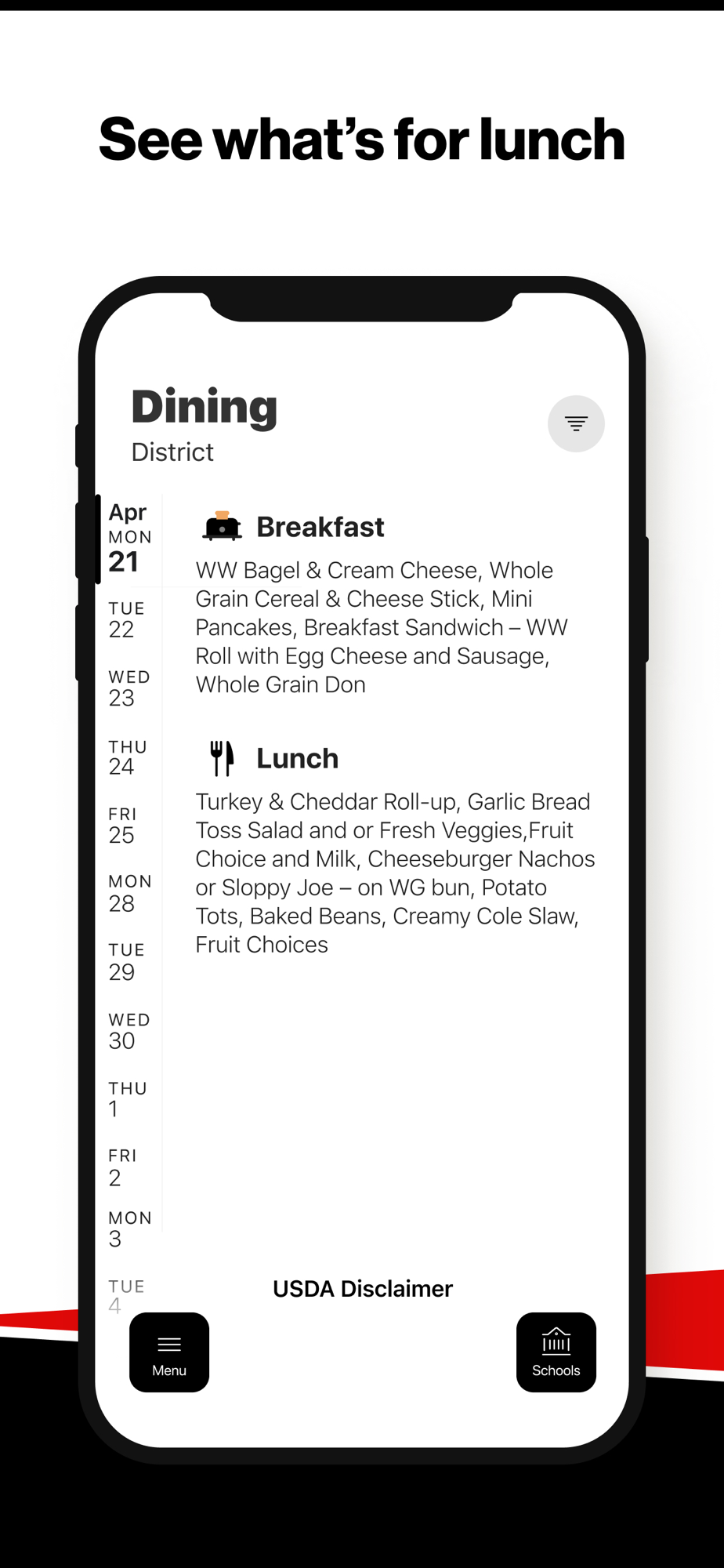 Within the dining section, you'll find an easy to navigate, weekly menu, sorted by day and meal type.