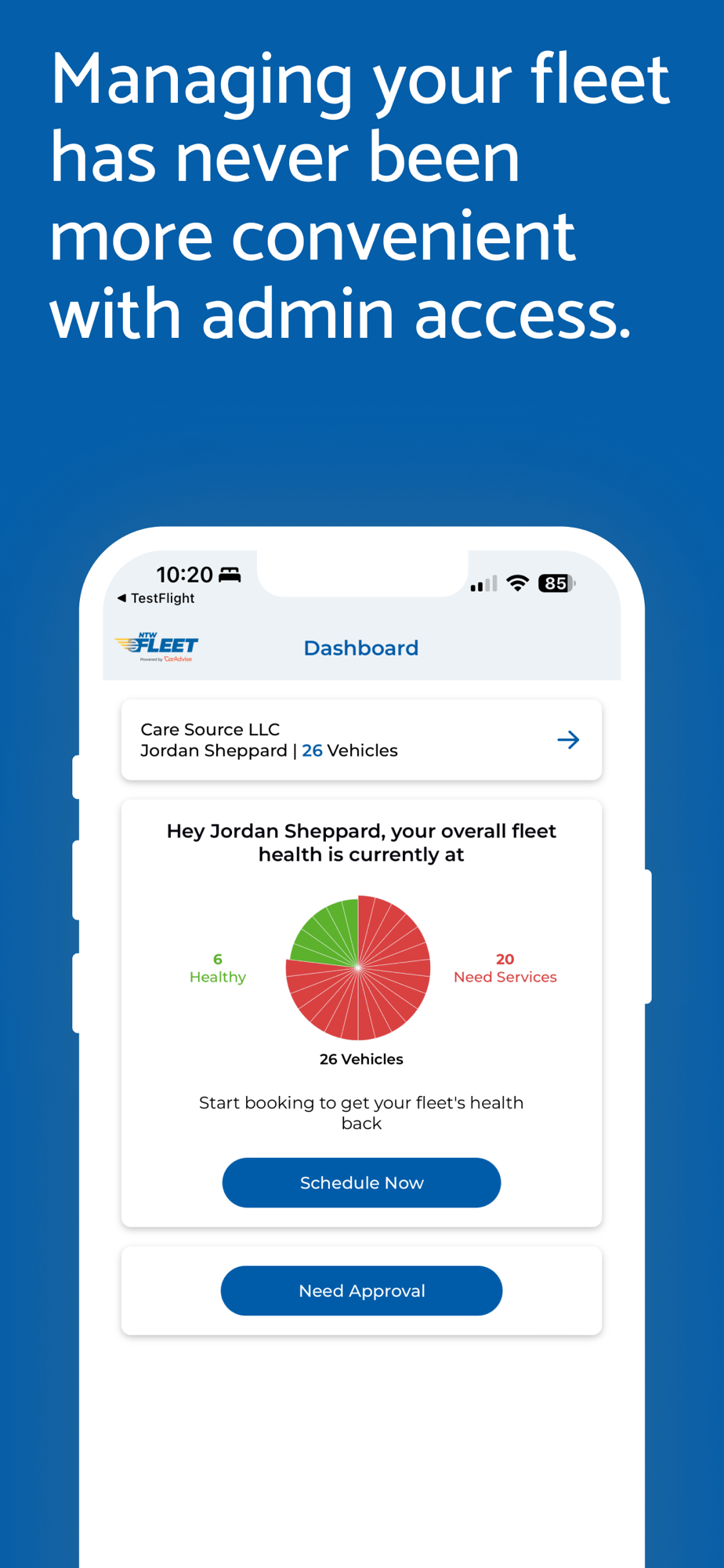National Tire Works Fleet offers new features to manage your fleet entirely from the app. Fleet admins can select from which fleet to manage, add a driver to a fleet, assign a vehicle to a driver, and view fleet health reports on the dashboard.