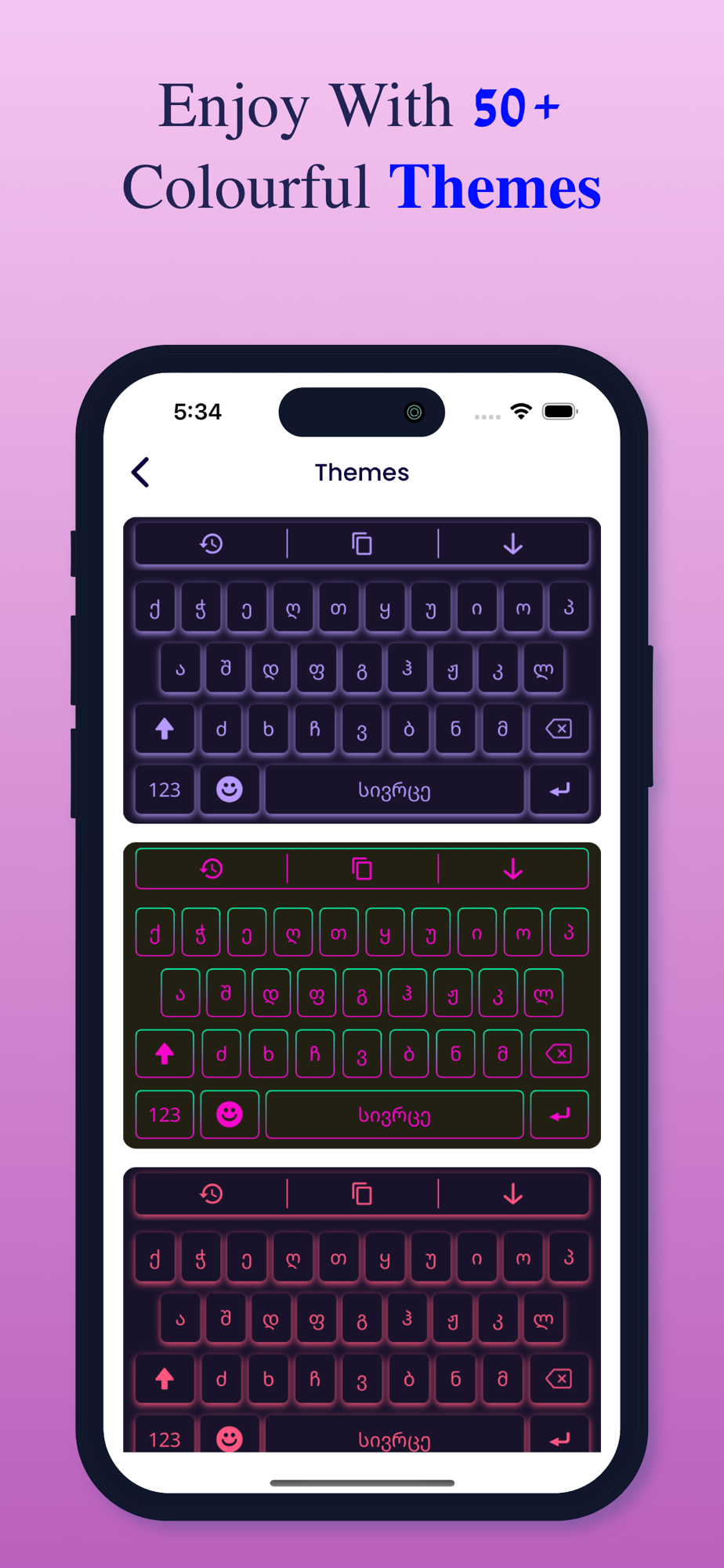 3. Customization Options: Personalize your keyboard with various themes and color schemes to match your style and preferences. Make typing in Georgian a visually appealing experience.