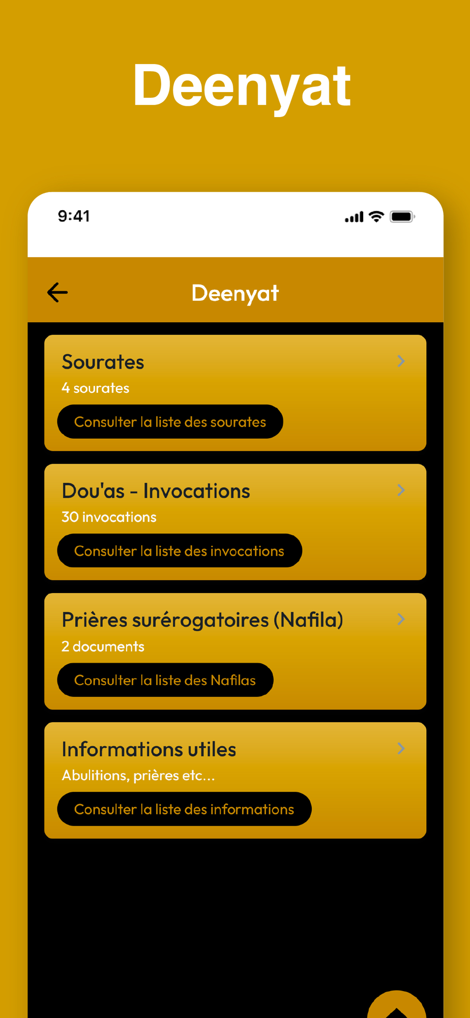 L’onglet Deenyat fournit des rappels importants sur des prières (obligatoires et surérogatoires), les douas, et la lecture du Coran.