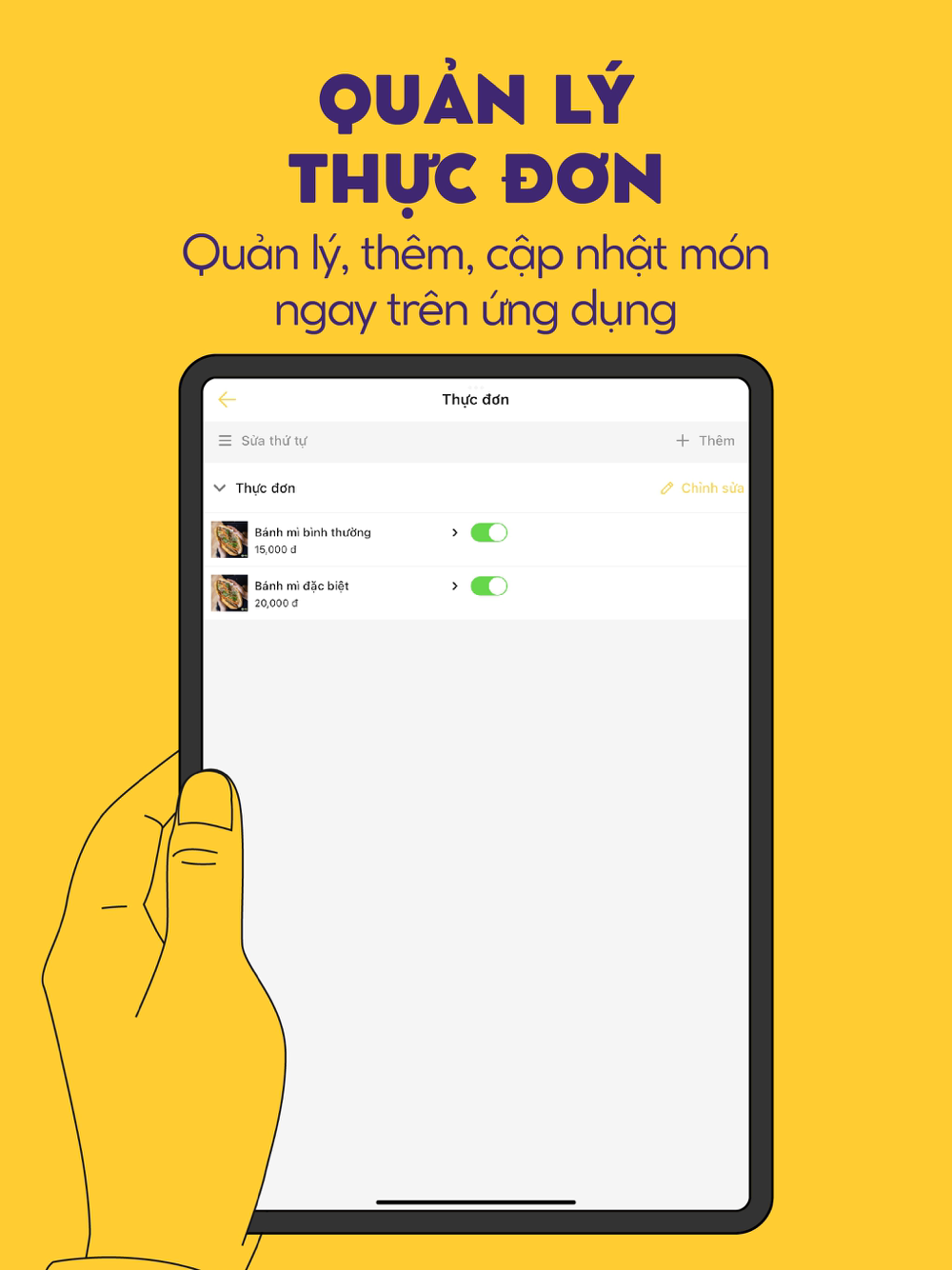 - Quản lý menu: Thêm, sửa, xóa món ăn, cập nhật giá, hình ảnh và trạng thái món ăn.