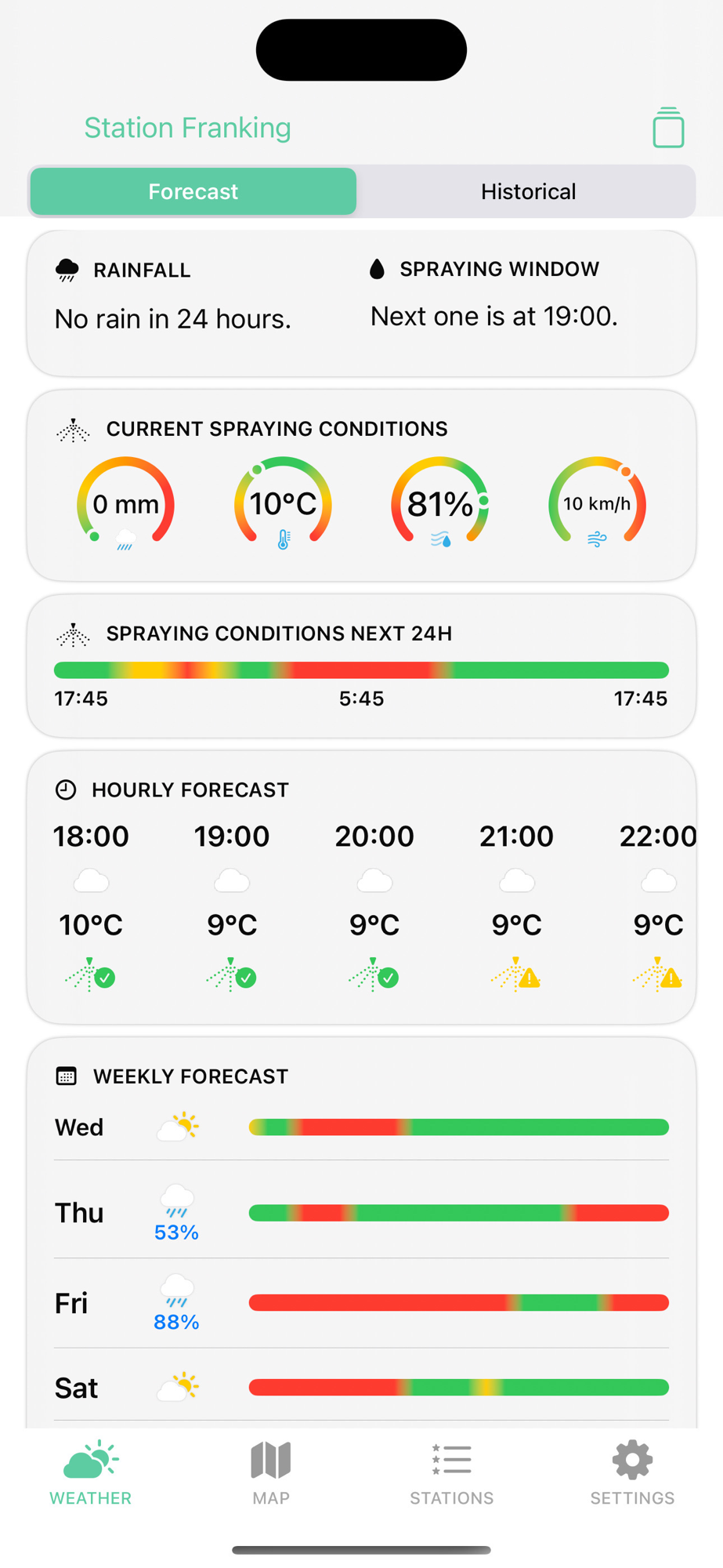 Most of the regular weather apps show the weather for the villages and cities. But what if your field is far await in the country? Wind speed and rainfall might vary from place to place, so better to have the forecast right from the field. You can do that with Mak – set up your virtual weather station and monitor spraying conditions, rainfall forecast, weather history and more!