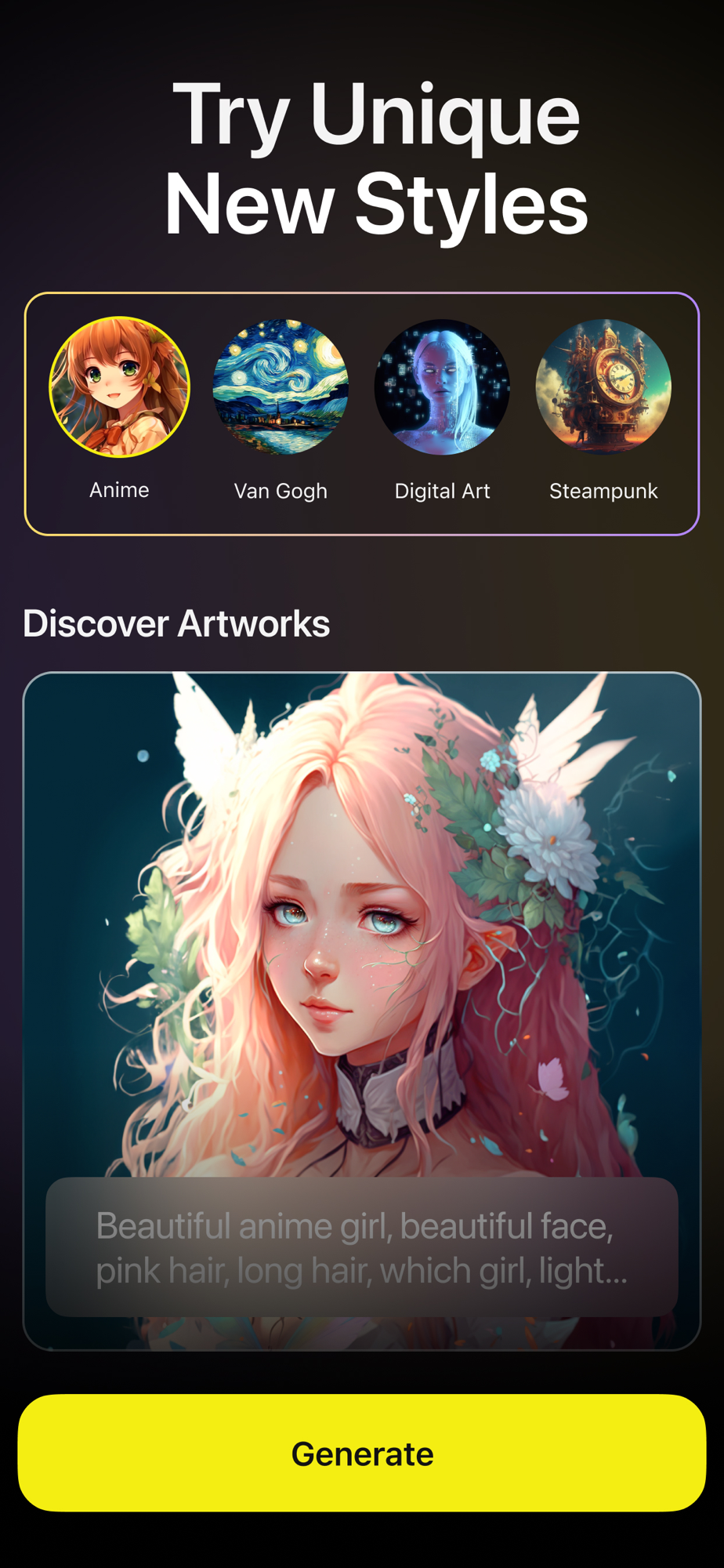 Create unique AI Art with Stable Diffusion AI Art Generator app. Turn your ideas into AI Art by using the most advanced AI Art Photo Generator. Just type a prompt, choose an AI art style, and let Stable AI Art Generator to create unique artwork in just a few seconds for you. Stable Diffusion AI Art Generator app uses artificial intelligence technology to transform any text to AI Photo. Try this new way of creating art and use the power of AI.