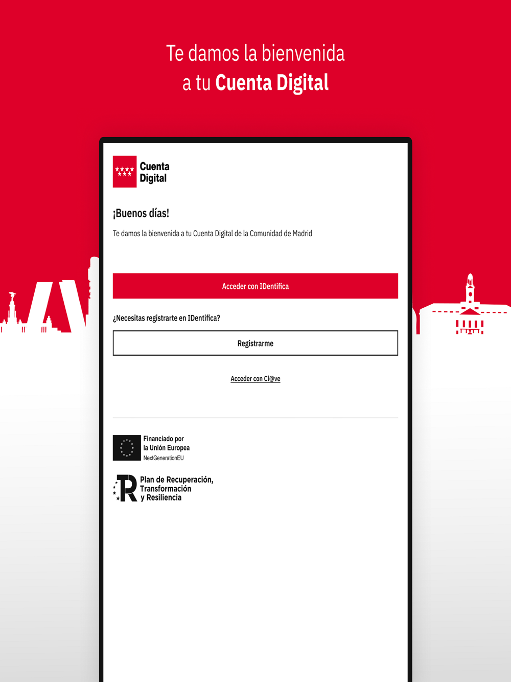 Regístrate con IDentifica, el Sistema de identificación y firma electrónica de la Comunidad de Madrid, o introduce tu Certificado digital, Clave PIN o Clave permanente para disfrutar de todos los servicios que te ofrece esta App.