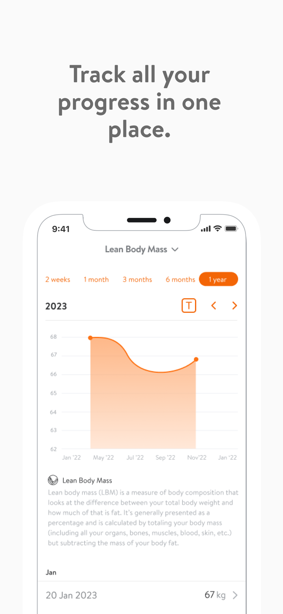 - Track body measurements and take progress photos