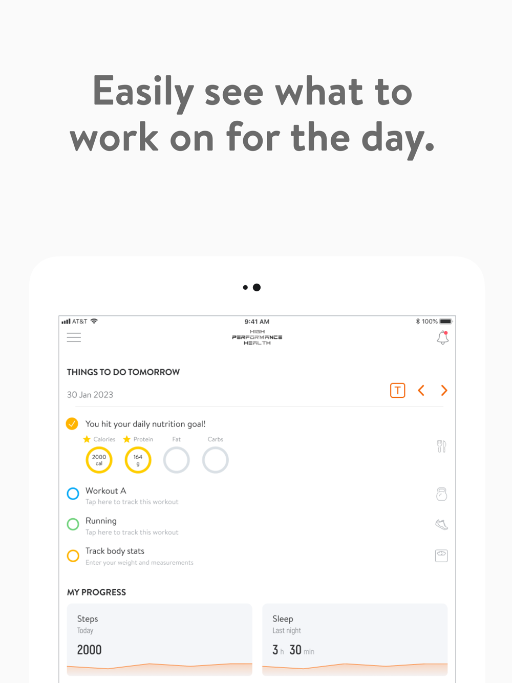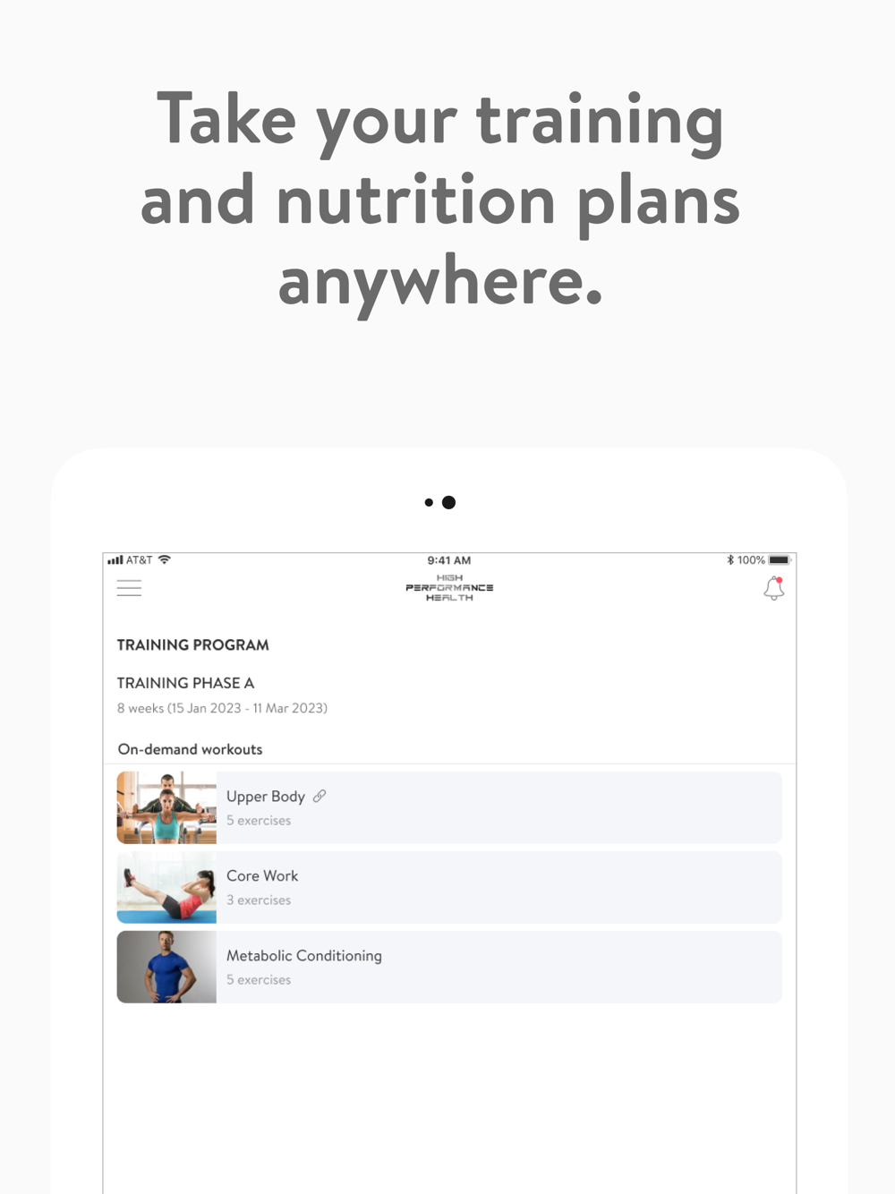 With the High Performance Health App, you will have access to workout programs designed specifically to help you reach your fitness and health goals! You can follow & track your workouts, your nutrition, your lifestyle habits, measurements and results–all with the help of your coach.