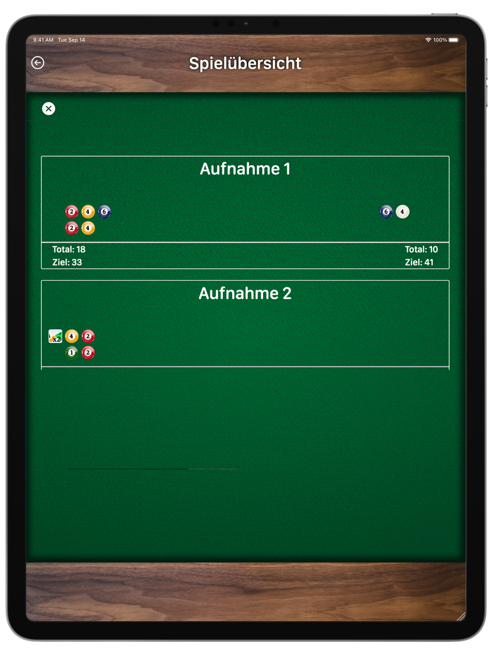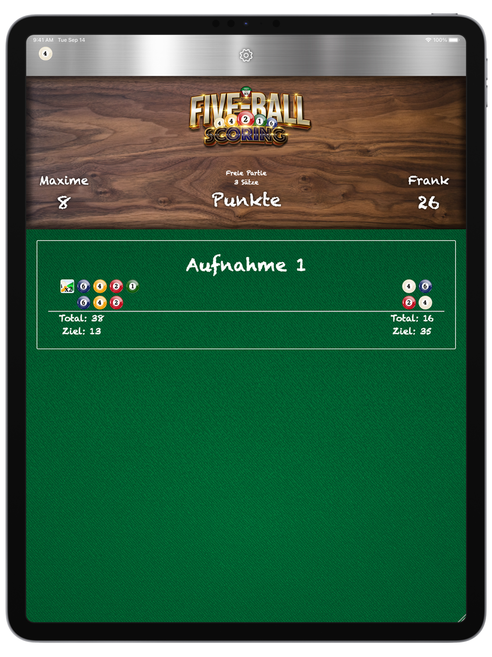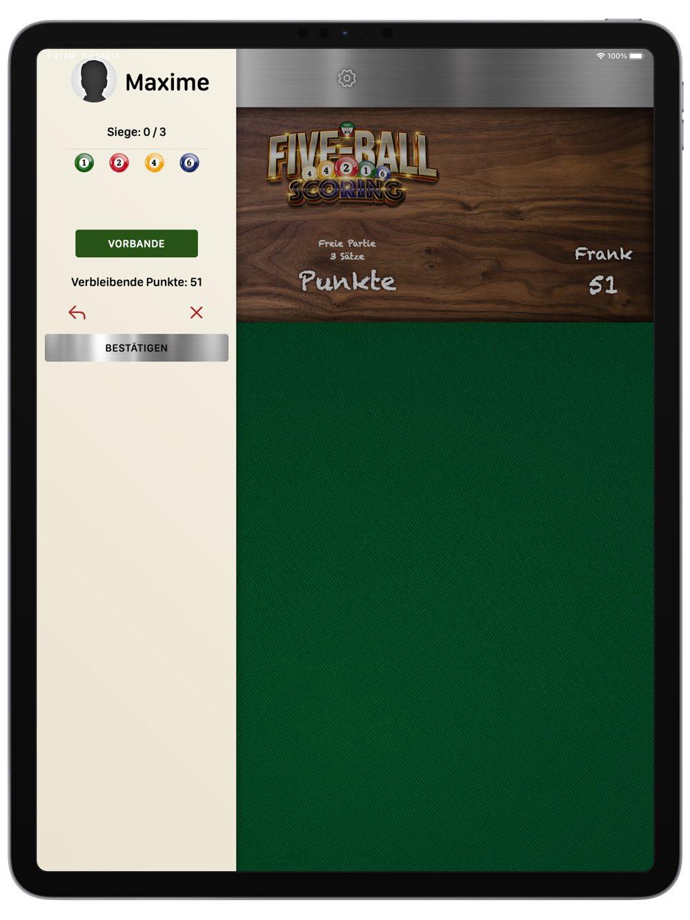 In addition, many players found it noticeably difficult to calculate the points played per shot in their heads, which often led to discussions and game cancellations. In order to absorb all this and to optimize the fun of this still quite young discipline of carom billiards for everyone, we then developed an app - the FIVE-BALL SCORING APP - specially tailored to our variant of FIVE-BALL CARAMBOL.
