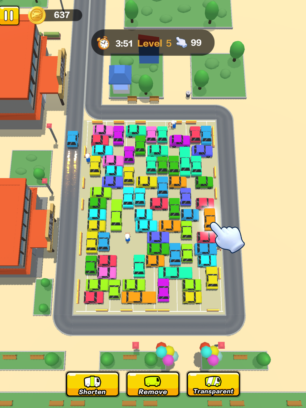 There are too many cars cluttering the parking lot. Now you are the commander of this parking lot. As a parking master you have to drive all the cars and get them on the road correctly without any collision. Try to design a reasonable movement route for these cars as much as possible. Be careful not to have any accidents! All kinds of traffic jams and troublesome parking spaces are waiting for you. You need to think outside the box, plan your movement route rationally, solve these tricky levels, and train your strategic thinking while relaxing!