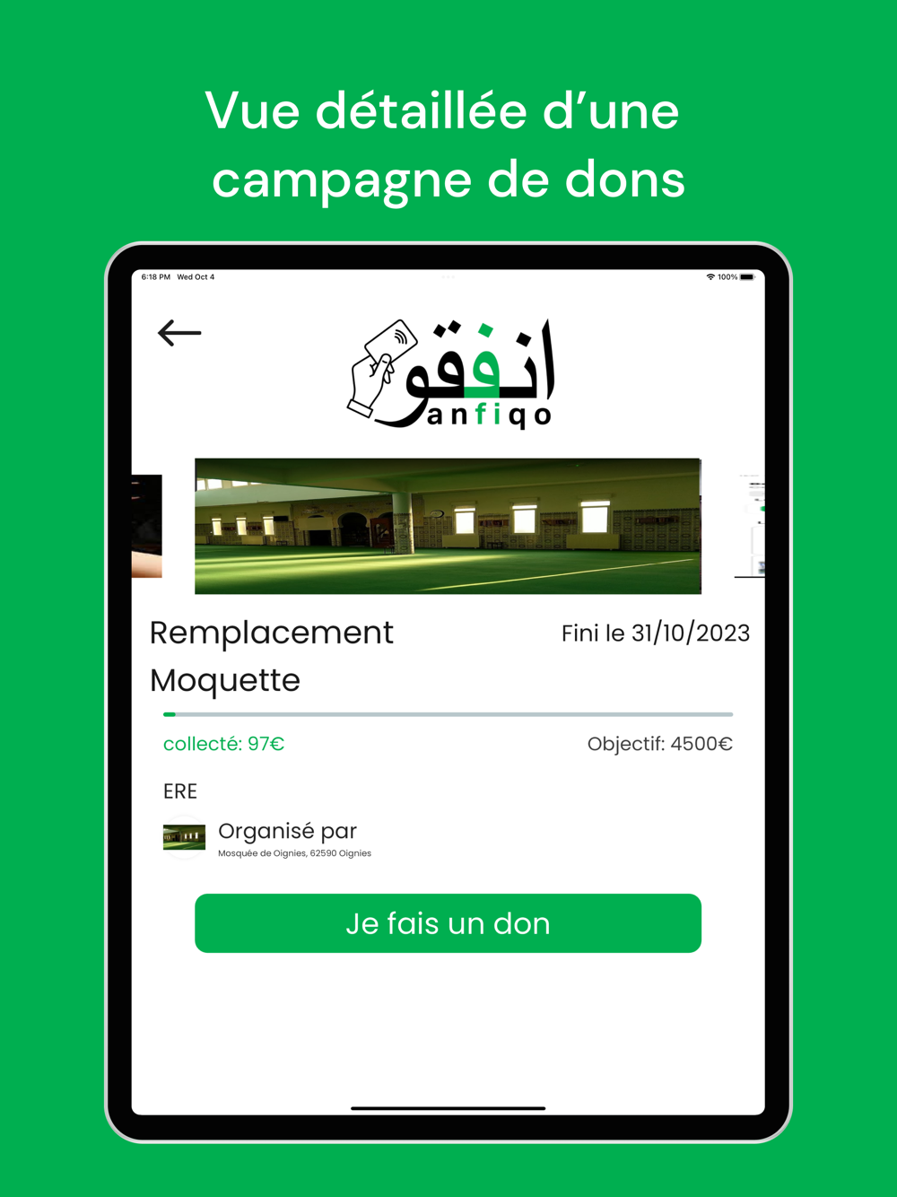 Anfiqo est une solution de collecte de dons pour les associations afin de permettre d'utiliser les moyens digitaux et autonomes pour collecter les dons, les cotisations etc...Il vous suffit juste d'acheter un écran tactile ou une IOS et d'installer l'application. L'inscription se fait sur le site www.anfiqo.com. Les donateurs peuvent aussi télécharger l'application Anfiqo depuis leur smartphone et faire des dons auprès des associations de leur choix. Les utilisateurs recevront des notifications pour chaque nouvelle campagne disponible. Anfiqo, c'est une tablette ou écran tactile connecté à terminal Sum Up Air. Avoir un compte Sum Up est donc indispensable afin de recevoir vos dons directement sur votre compte bancaire. Anfiqo ne prend aucune commission et ne facture aucun frais. Seuls les frais habituels Sum Up seront déduits par Sum Up directement.