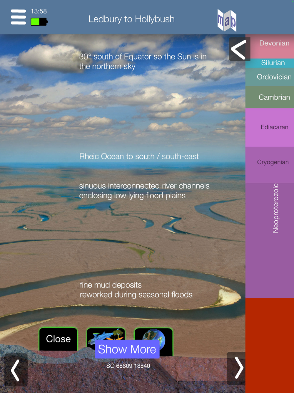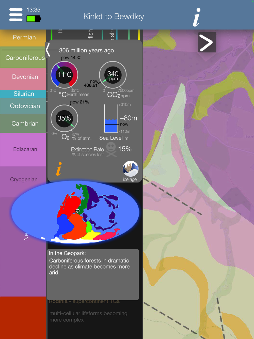 A timescale of the 4.6 billions years of the Earth’s history is aways available and animates to track the rocks currently below you. This includes information on the possible global conditions at the time - atmospheric levels of carbon dioxide and oxygen, mean global temperature, sea levels, extinction rate, along with significant events of the time e.g. ice ages, major basaltic eruptions, meteorite impacts, tectonic situation, etc.