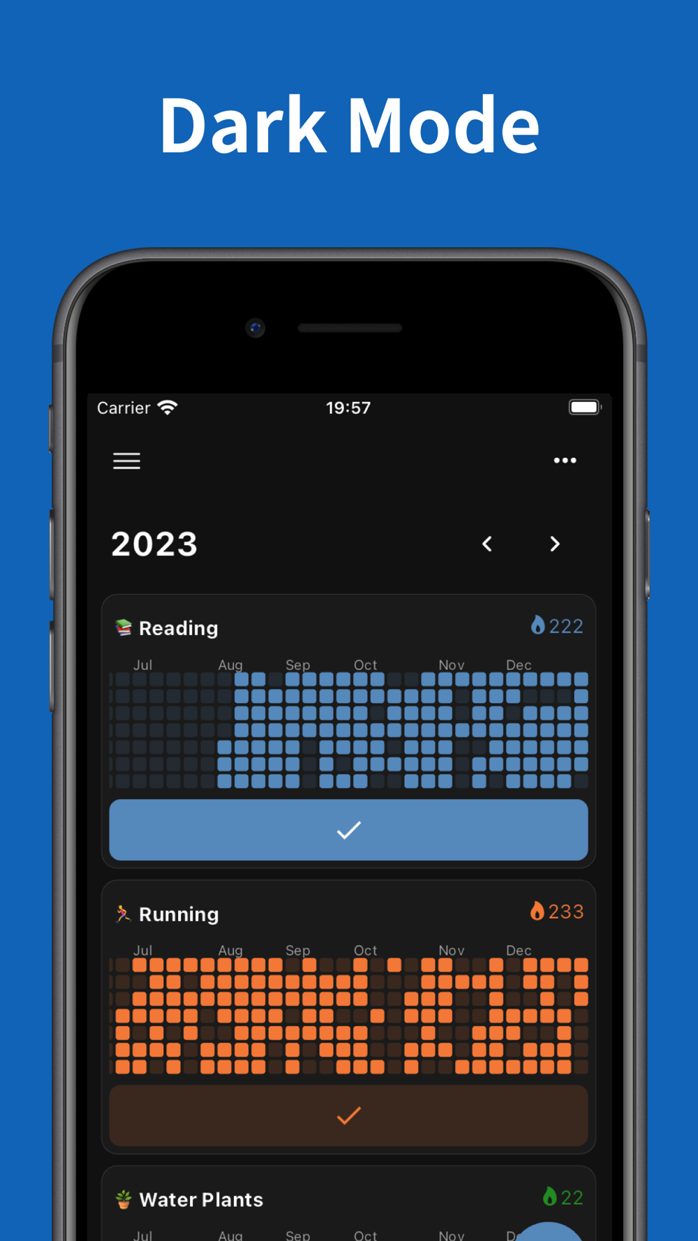 Dots is built with simplicity in mind. A single tap on the home screen is all it takes to record your progress, making consistency a breeze.