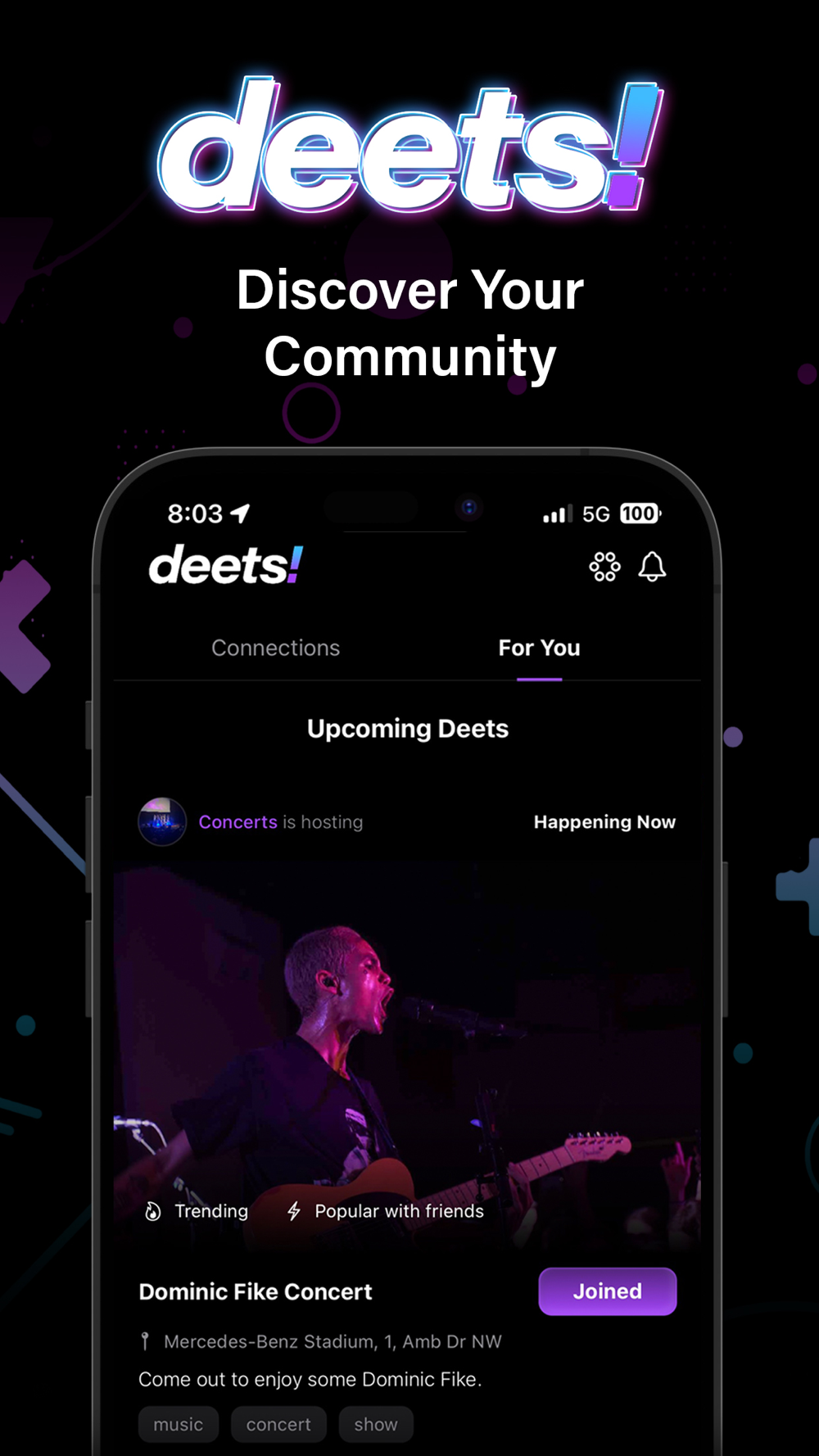 Deets: Discover Your Community Deets is an experience management social app that bridges the gap between online interactions and real-world connections. Features: User-Friendly Design: Navigate with ease and discover a user-centric interface designed with you in mind. Communities & Messaging: Dive into curated communities, strike conversations, and foster relationships Attendance Tracking: Organize and manage your community and events in one centralized place. Shared Memories: Capture, share, and relive moments. Discover / Personalized Recommendations: Get tailored suggestions on events that resonate with your interests. Anonymous Feedback: Voice your opinions, share feedback, and contribute to a platform that values your insights. Our Essence: Deets goes beyond being just another social or event management app. It's an initiative to create connections and foster communities Our Commitment: With Deets, we're championing the shift from mere digital sharing to tangible moment-making. Engage, discover, host, or join events and play your part in building a world that's a little more in touch, a tad more connected, and profoundly more human. Experience Deets and Discover Your Community.