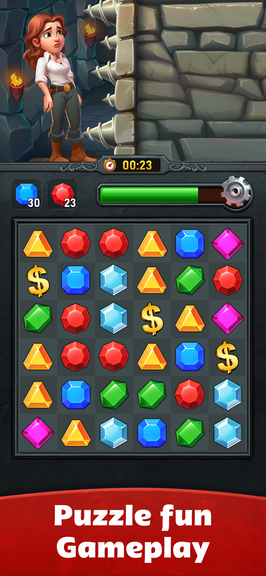 Embark on an epic adventure in Jewel Cash - Win Real Money, the most exciting and adventurous Match 3 Game! Join our daring adventurer as she navigates through danger, using your match-3 skills to help her overcome every challenge!
