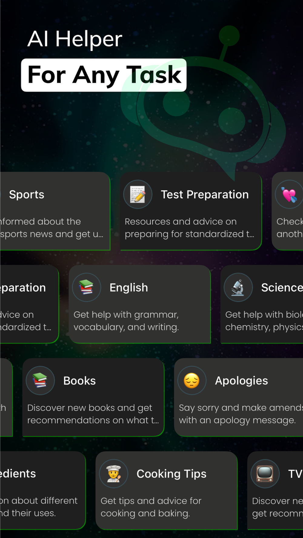 Talk with Smart AI is the perfect app for those seeking intelligent conversations and instant answers. Engage with the chatbot, explore various categories, and experience the power of AI at your fingertips. Download now and start conversing with our smart AI chatbot.