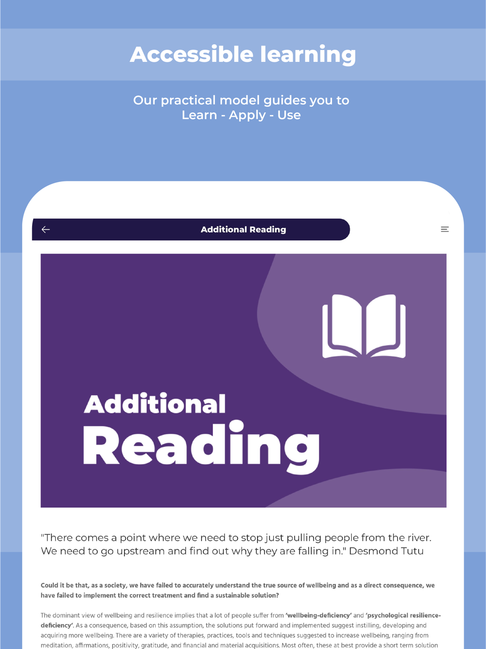 Our app offers the training and tools to activate resilience in everyone. We are not creating resilience. Our job is merely to tap into the existing resilience in every individual, thereby improving their wellbeing and, as a result, the harmony of households and the sustained productivity of organisations .