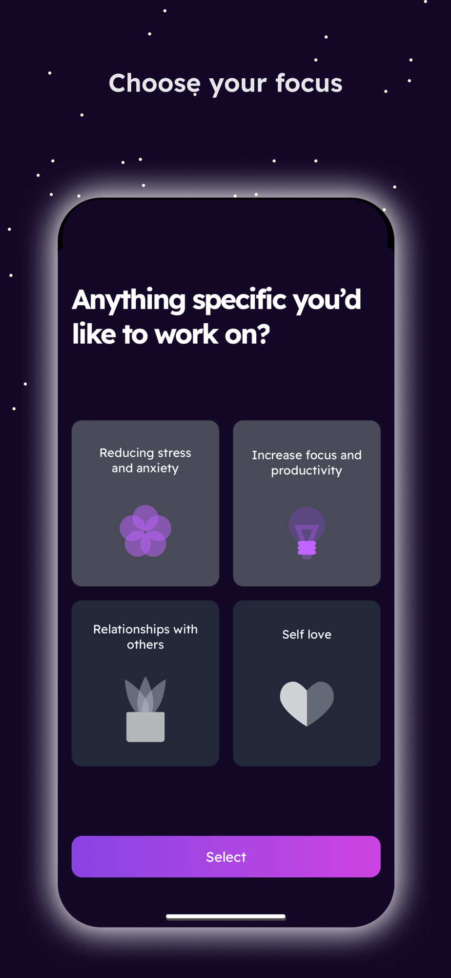 Choose your focus area—whether it's self-love, productivity, nurturing relationships, or conquering stress—and let our app guide you toward a more fulfilled life.