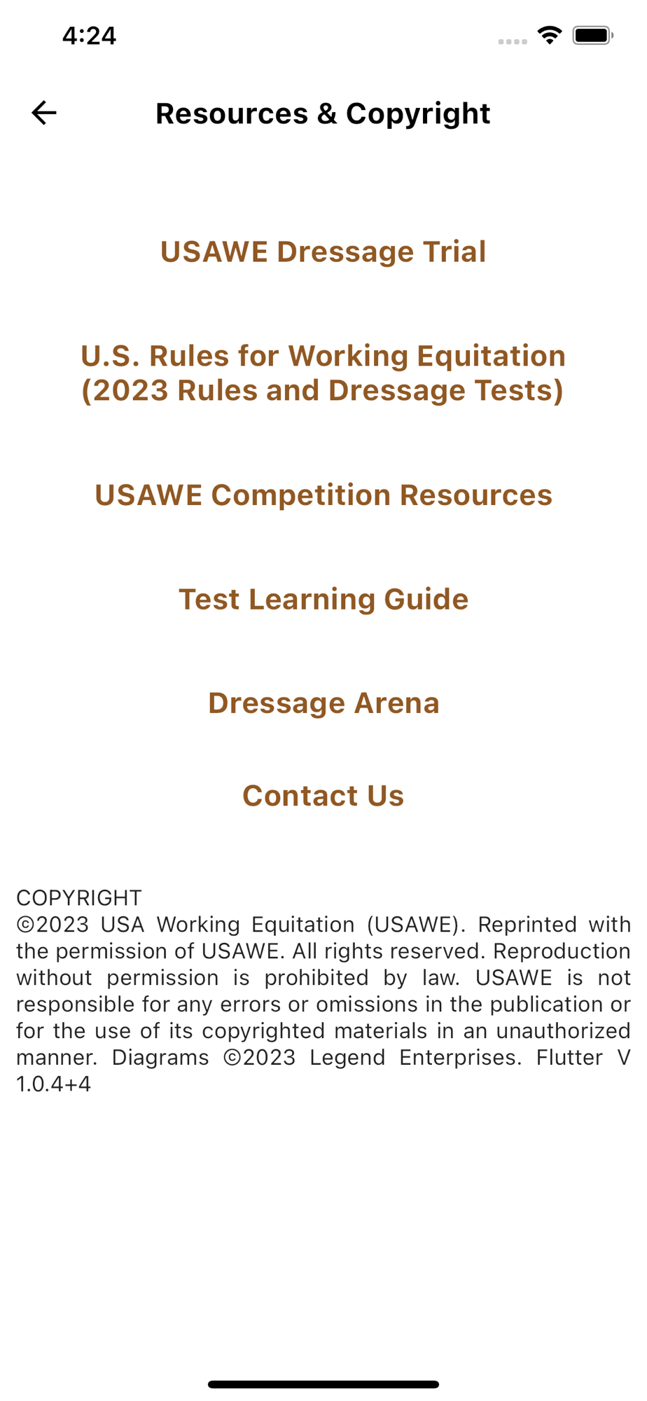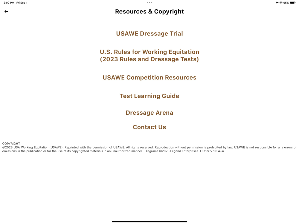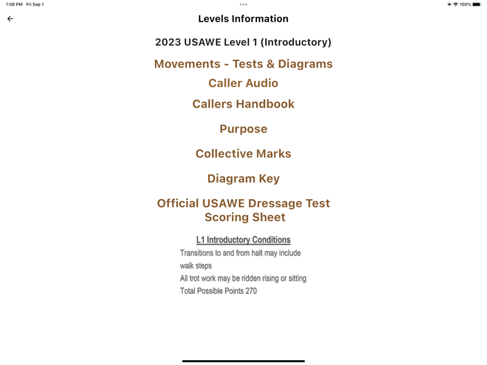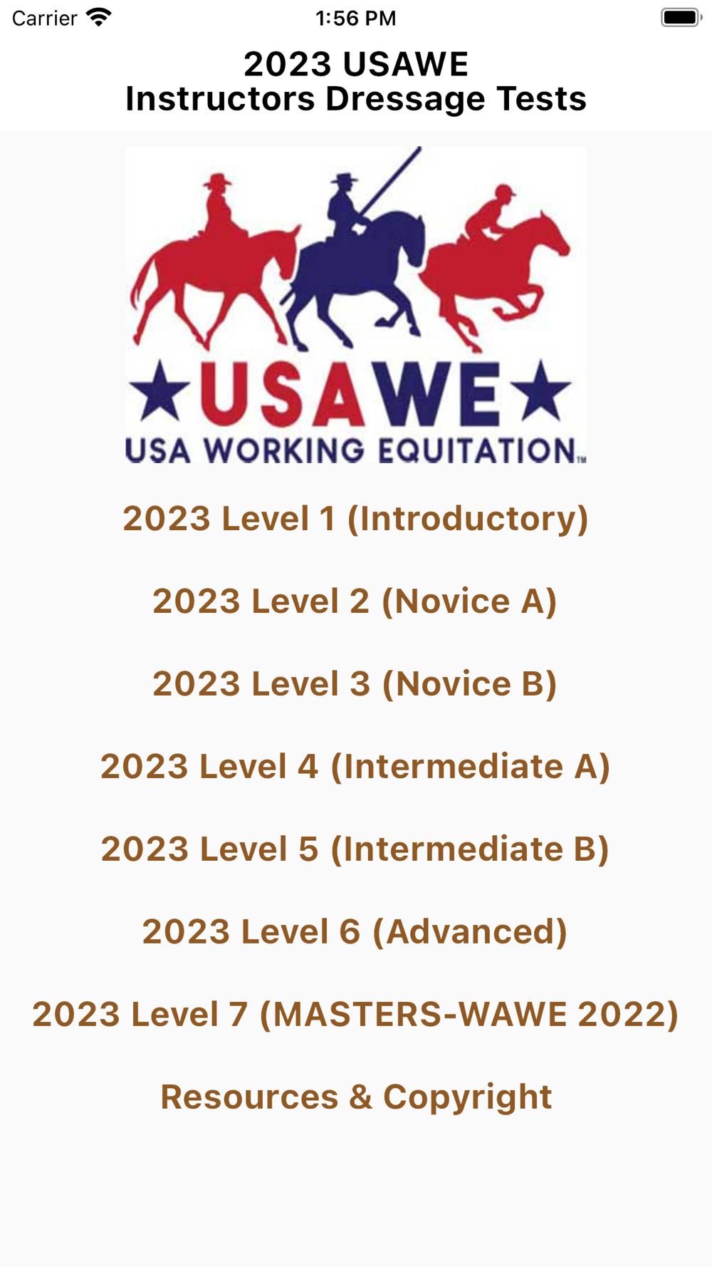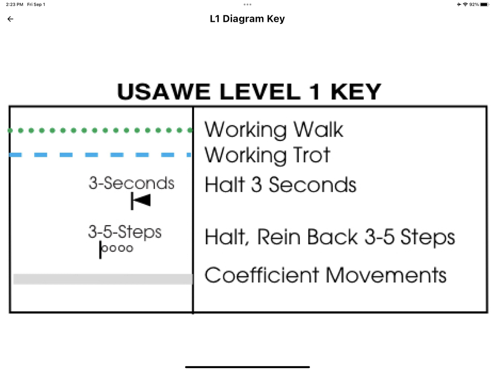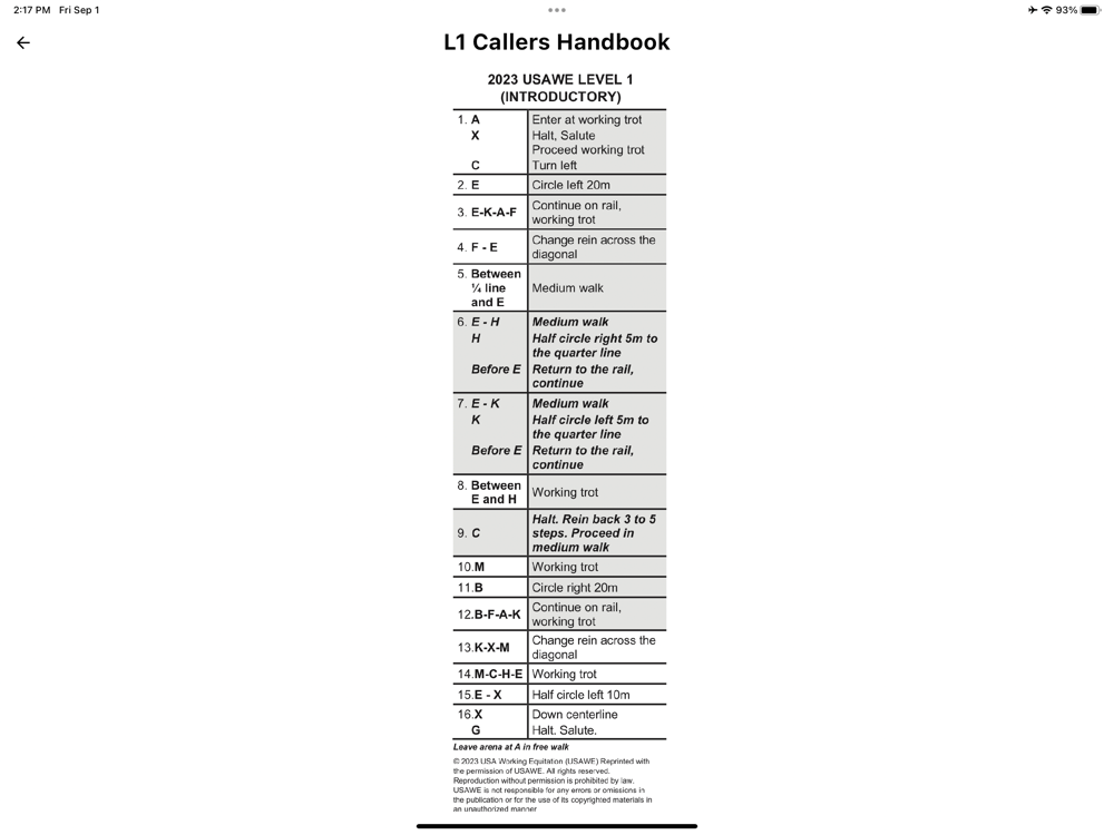 Easy to read text and graphic diagrams of the 2023 USA Working Equitation (USAWE) Level 1-6: Introductory, Novice A, and B, Intermediate A, and B, Advanced, and Masters Tests.