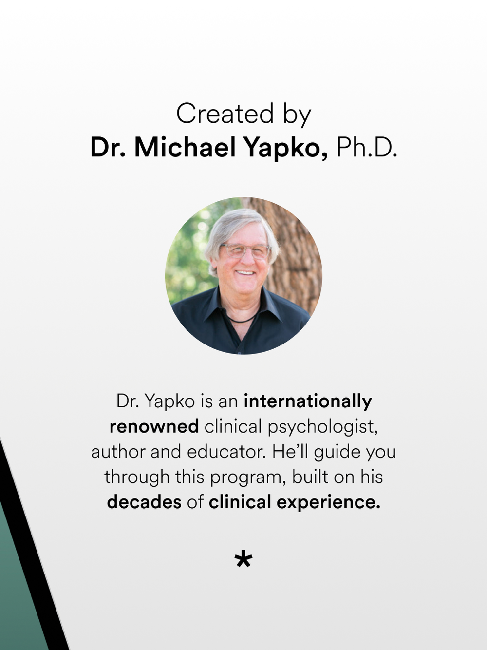 Mental Health by Mindset was created alongside Dr. Michael Yapko, a clinical psychologist internationally recognized for his work in advancing clinical hypnosis and outcome-focused psychotherapy. Dr. Yapko’s approach puts to work well established research that shows the addition of hypnosis to CBT raises its overall effectiveness.