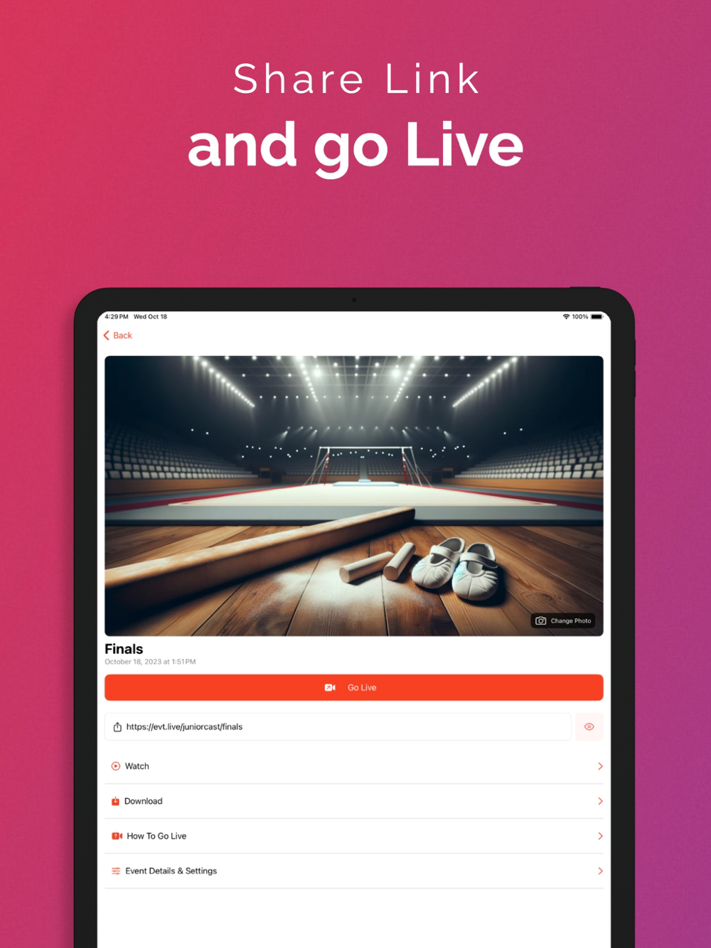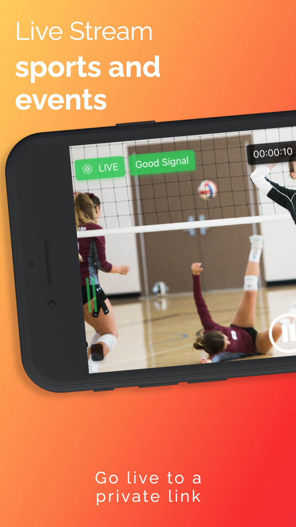 The app comes with a private streaming link to share with your guests. Great to live stream baseball, basketball, soccer, football, tennis, ice hockey, field hockey, rugby, lacrosse, volleyball, softball, golf, swimming, gymnastics, wrestling, track and field, cross country, cheerleading, dance competitions, ballet recitals, band concerts, choir performances, theater shows, and any other youth sports games or school events.