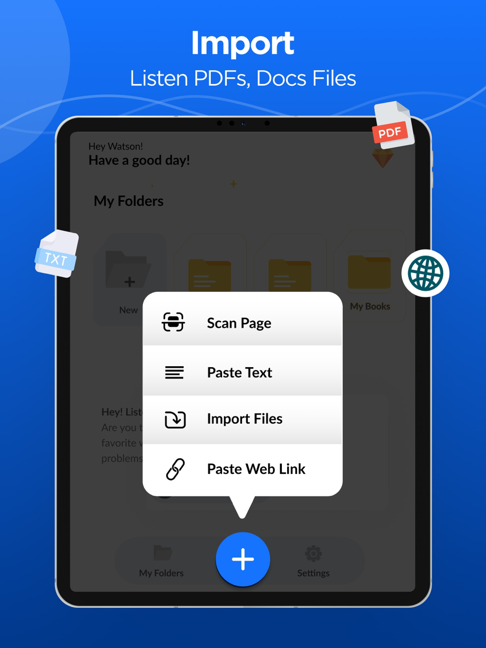 Listen to PDFs, docs, books or any text using read aloud TTS app. Discover a transformative reading and listening experience simultaneously with text to speech reader. Voice aloud reader app provides the ultimate listening experience and converts written content in to natural, lifelike speech for anyone that wants to listen any text.