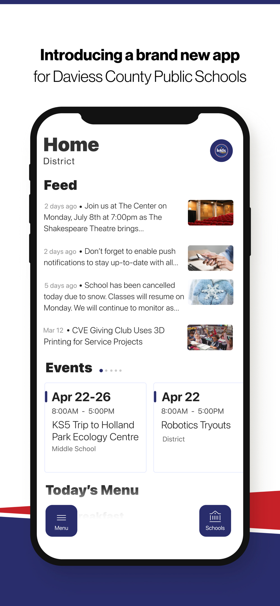 The event section shows a list of events throughout the district. Users can add an event to their calendar to share the event with friends and family with one tap.