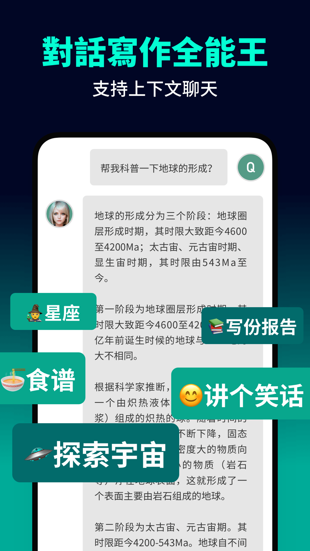 通過我們的 AI Chat 應用程序,您可以使用人工智能的各個領域發揮巨大作用,例如 微信,Instagram,facebook,微博,知乎,小紅書等文案創作、甚至TikTok,YouTube視頻腳本都不在話下,可以大幅提升了你的工作效率。