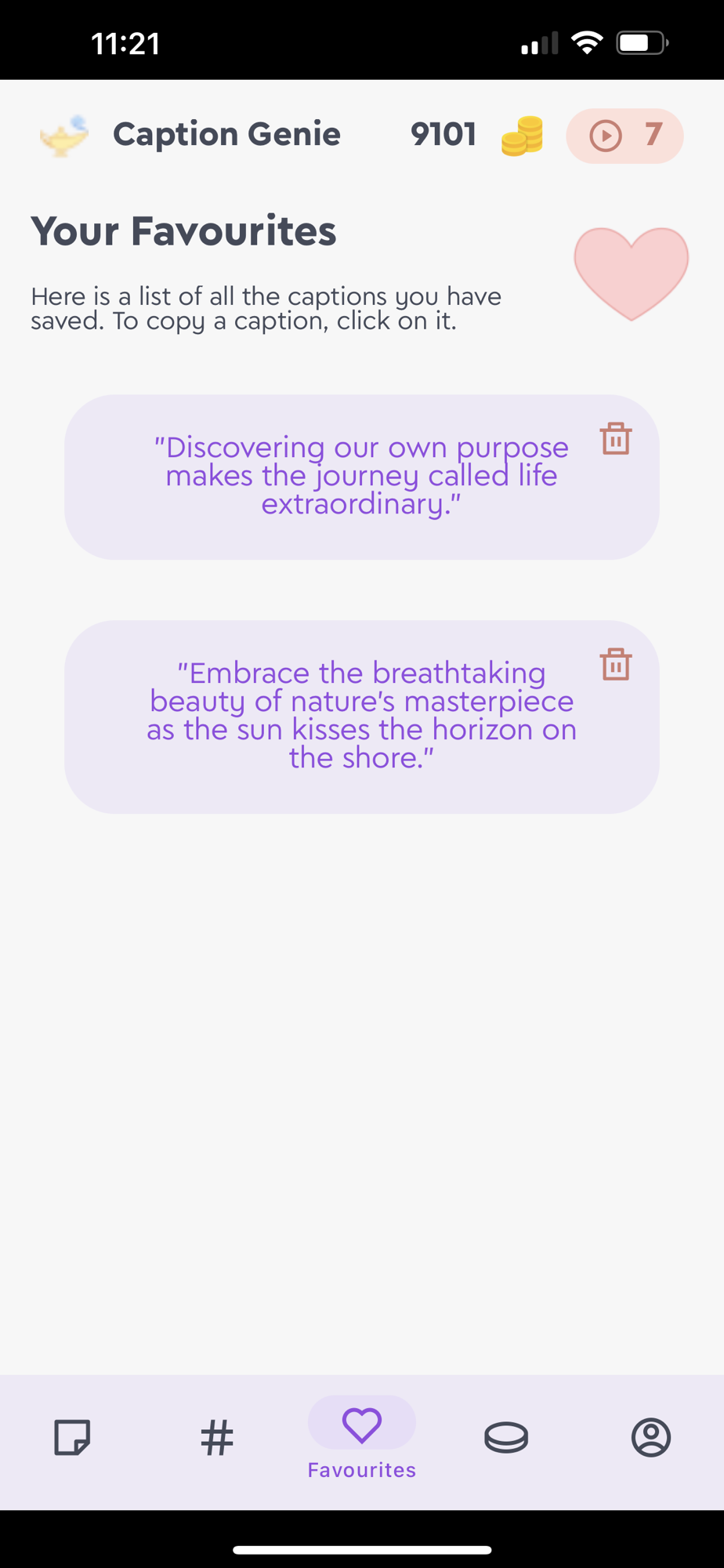 Maximize your online presence with Caption Genie's SEO-savvy hashtags and captions, and take your social media strategy to the next level. Save your favorite captions for later in the app's favorites section, and streamline your content creation process with Caption Genie.