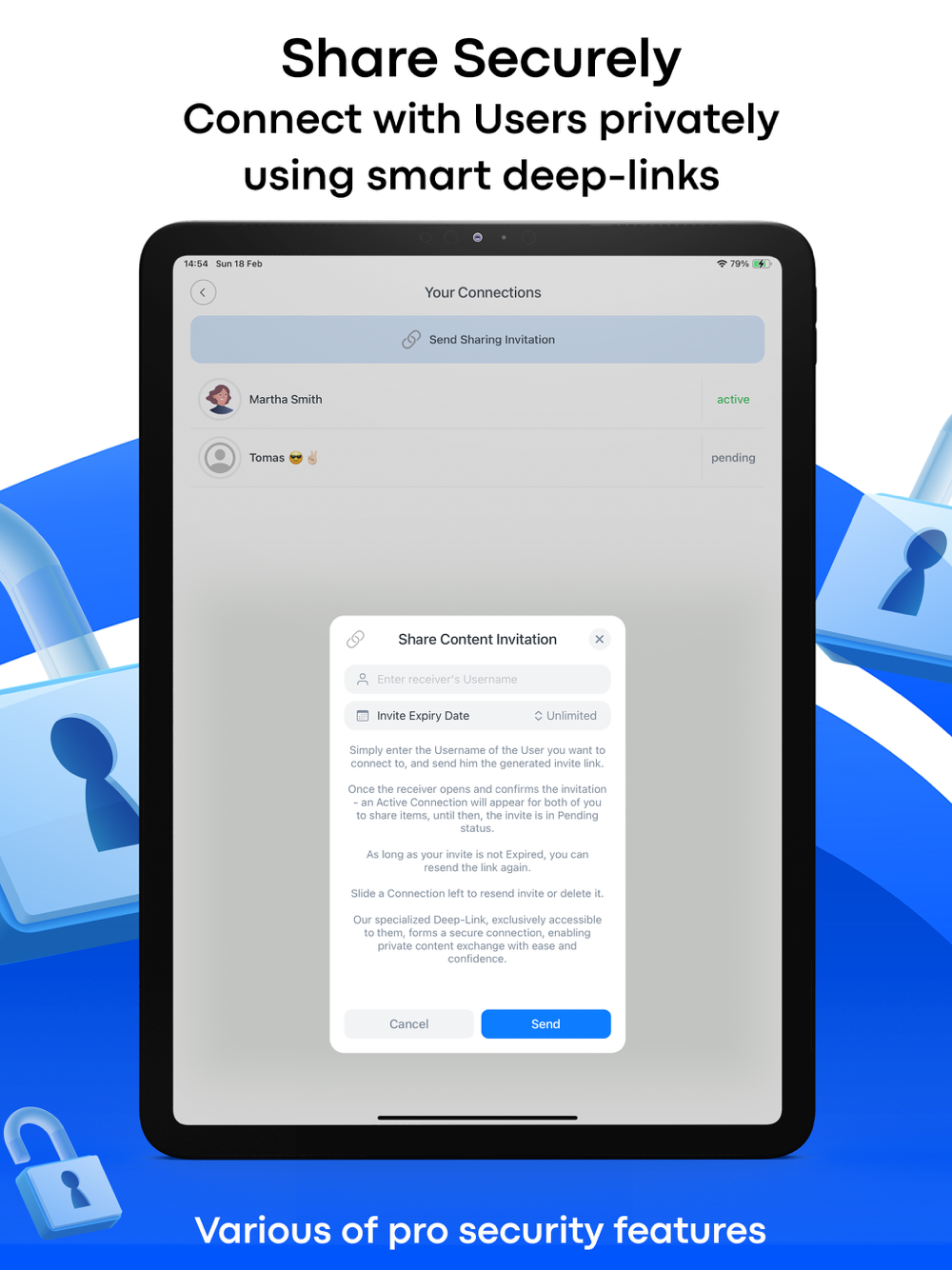 ◆ Share private items securely with PassKeys Pro's in-app system with approved family and friends through encrypted connections.