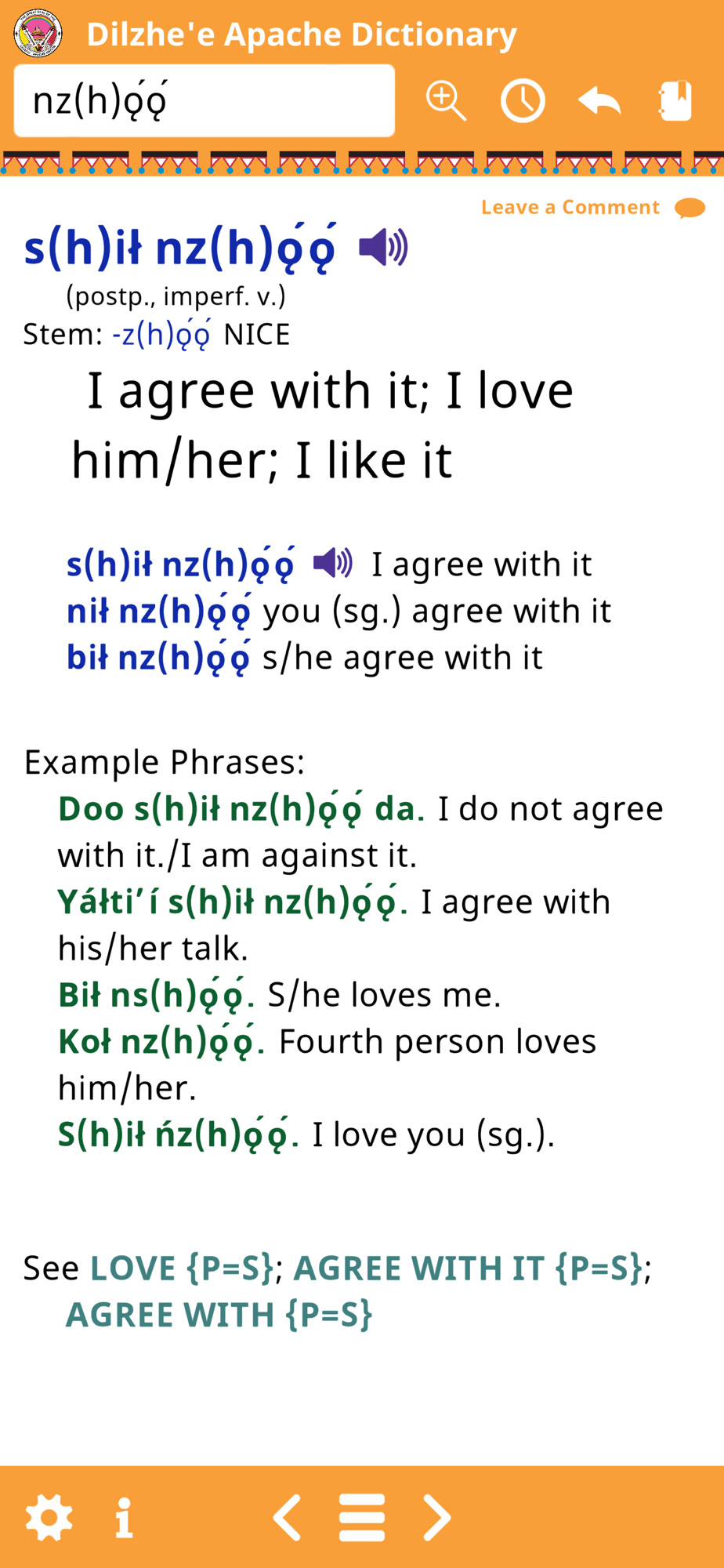 The Dilzhe'e Apache Mobile Dictionary is the best way to look up Dilzhe'e Apache words and hear pronunciation while on the go. It’s the ultimate electronic Dilzhe'e Apache learning and reference tool.