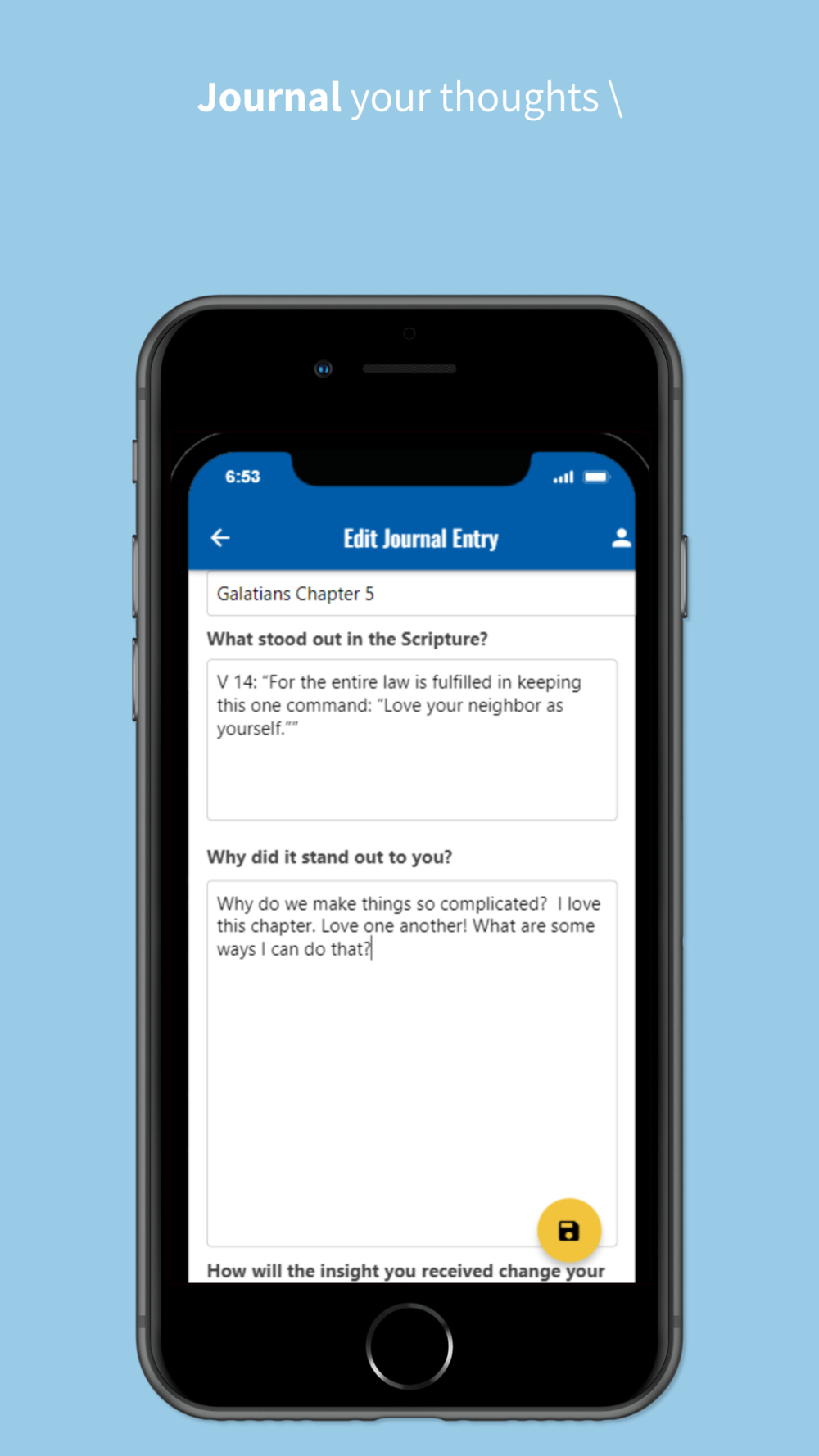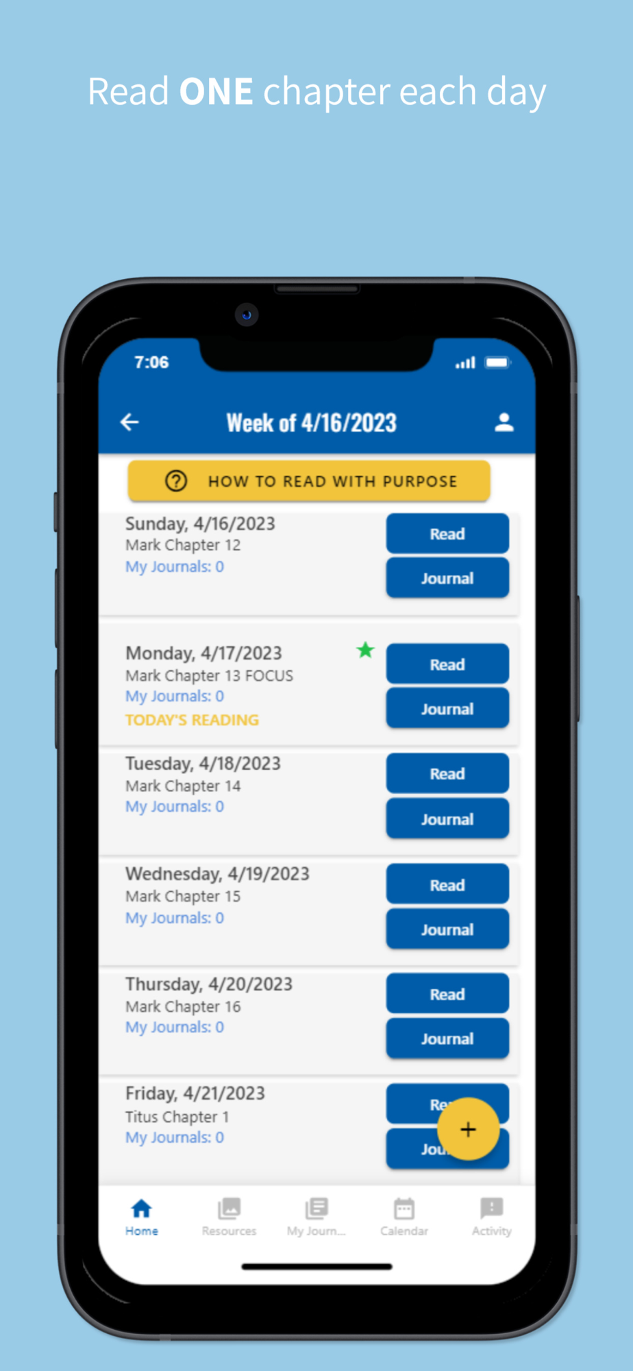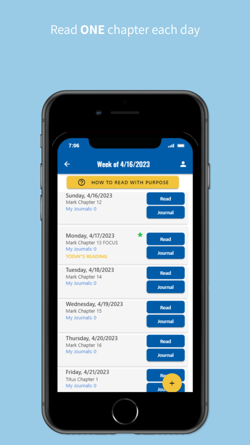 Reading God's Word with Purpose is a powerful method for reading the Bible. Read 1 chapter each day from the scheduled reading. Answer 3 simple questions - What stood out to you, why did it stand out and how is the insight that you received going to change your life. Optionally journal from your reading, making it easy to review how God's word is changing your life. It's an easy but very powerful way to experience the Bible. Follow other users who are reading in the app and optionally share your insight with others.