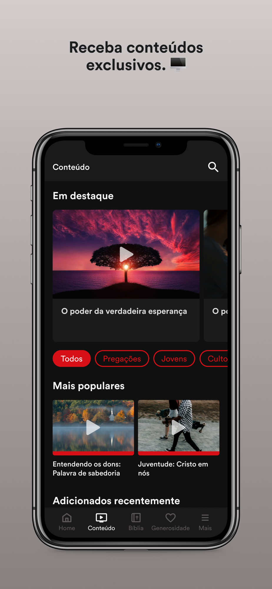 - Conecte-se com a igreja através dos grupos de interesse, receba conteúdo direcionado e obtenha sua carteirinha exclusiva.