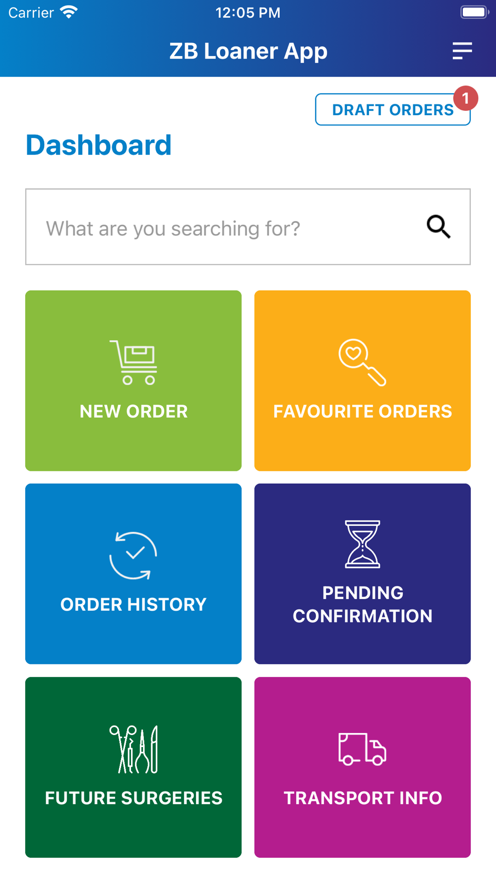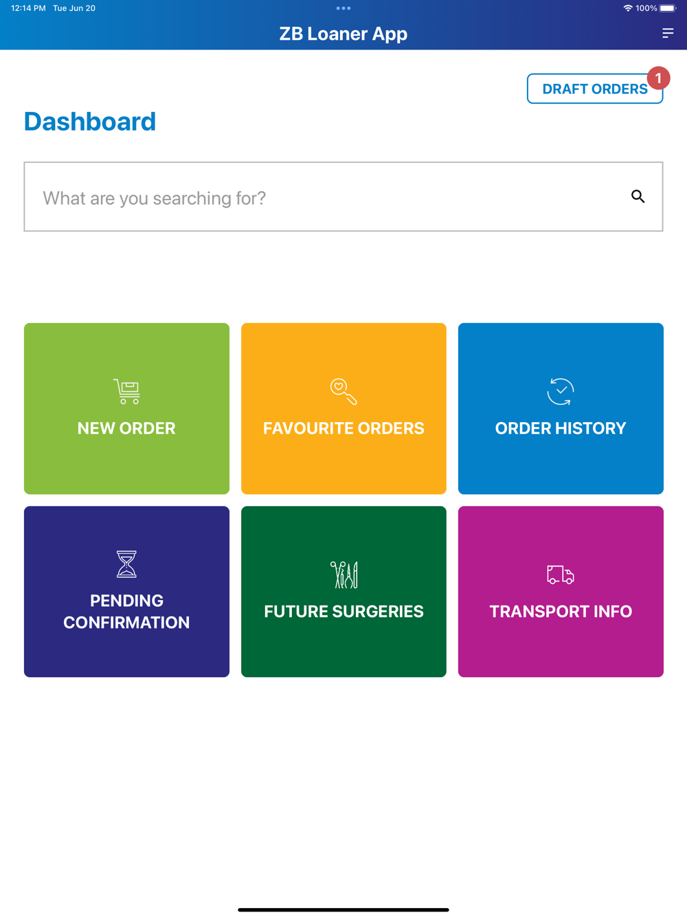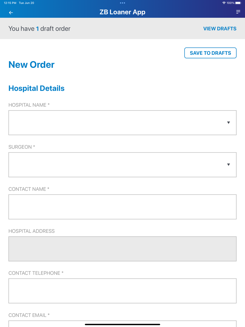 ZB Loaner App, from Zimmer Biomet, will streamline the process of identifying and ordering tools used in medical procedures involving Zimmer Biomet's products. This app takes sales representatives through a decision tree process which results in generating a notification to customer service containing the data required for the order.