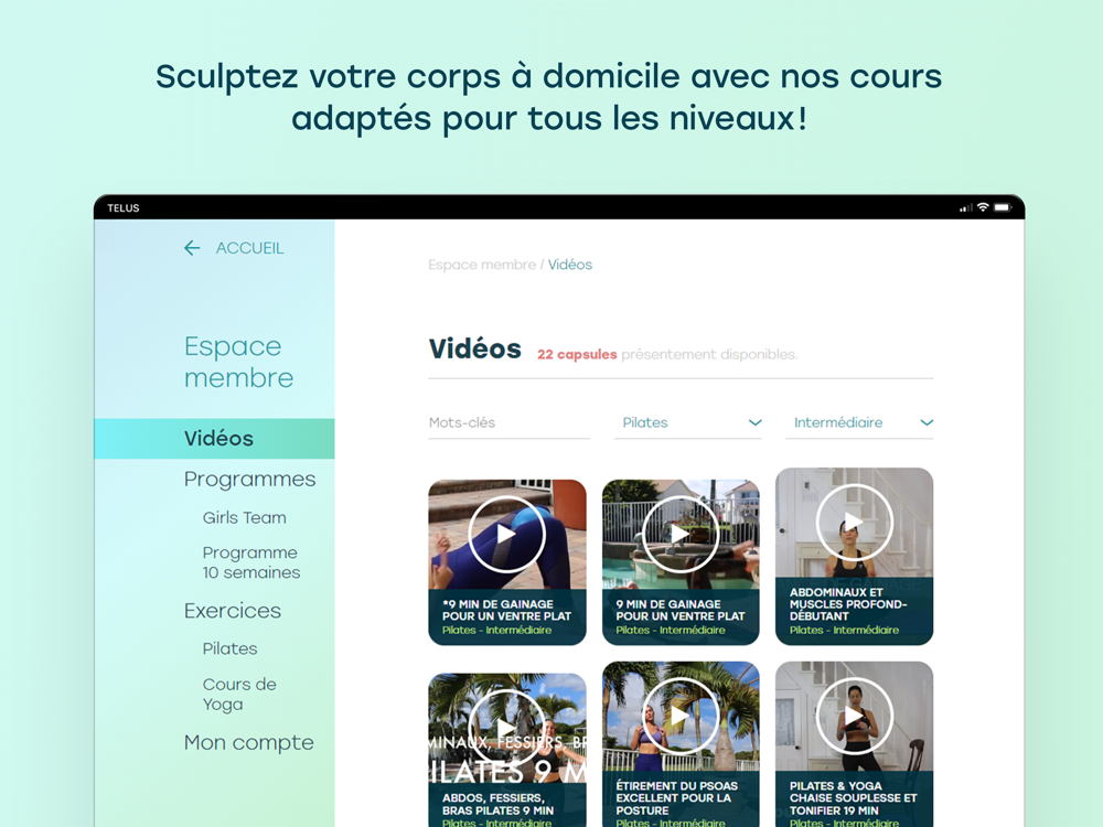 Accès à toutes les nouvelles séances de Pilates, Yoga et Fitness et les nouveaux programmes.