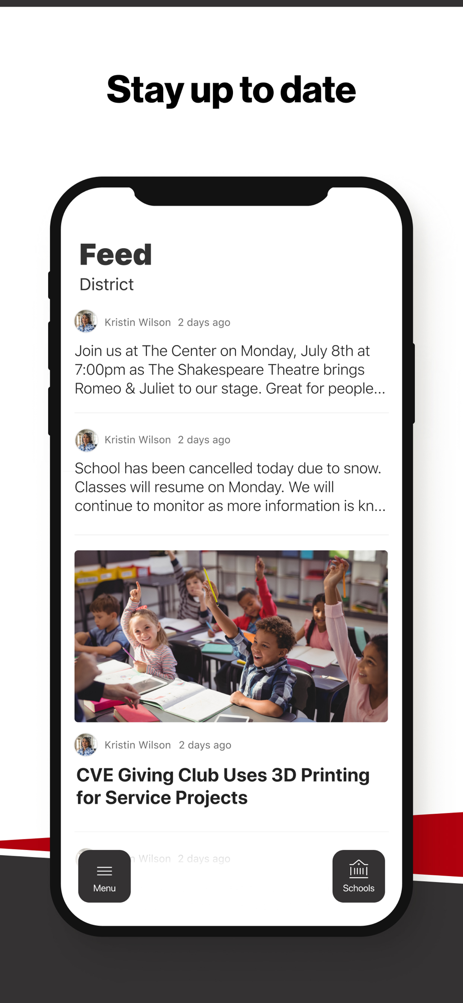 In the Live Feed is where you’ll find updates from the administration about what’s going on in the district right now. Whether that’s celebrating a student’s success, or reminding you about an upcoming deadline.
