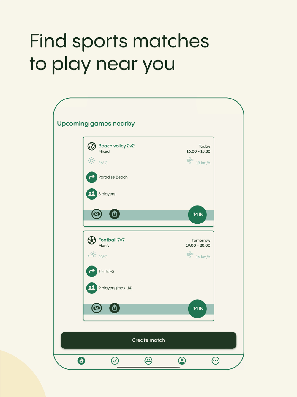• Dive into our vast selection of sports: from soccer and basketball to the fast-paced action of beach volleyball and ping-pong, the strategy of tennis and padel, to the fun of beach tennis and beach soccer. Whether you prefer traditional sports or are in search of something a bit different, OutyPlay has something for everyone.