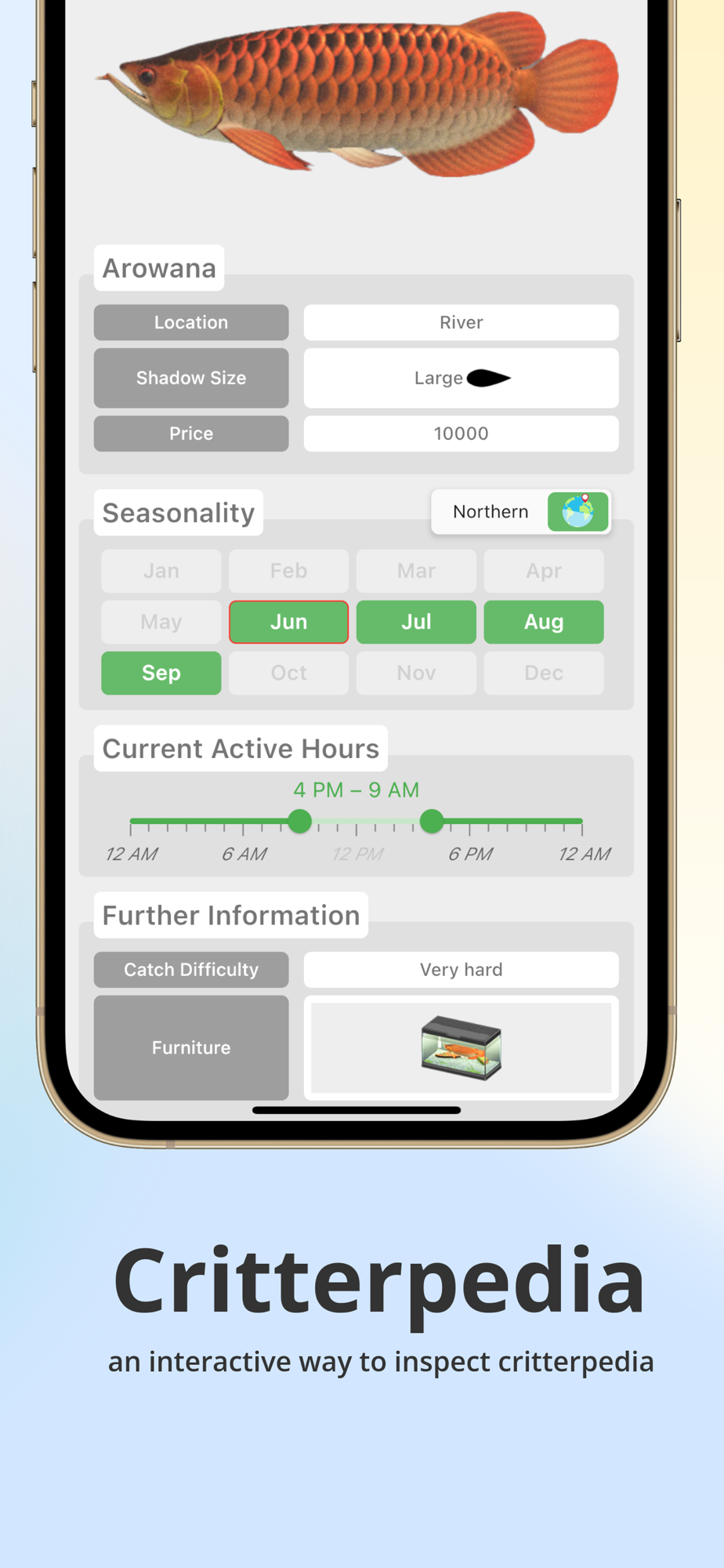 - Critter Tracker: Stay updated on the availability of fish, insects, and sea creatures in real time. Access detailed information such as active times, preferred weather conditions, pricing, and locations.
