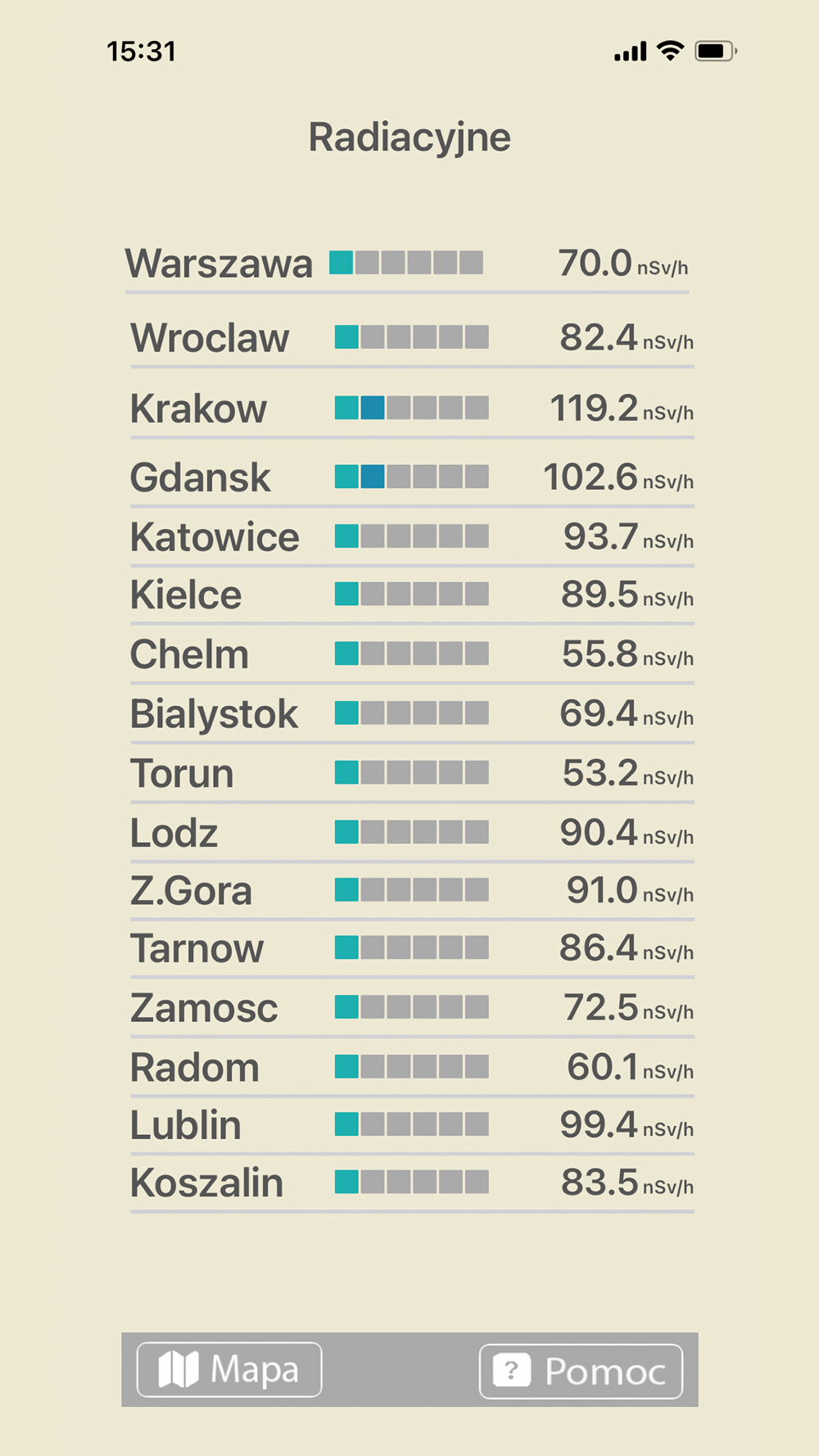 Aplikacja zbiera dane o promieniowaniu z oficjalnych czujników zlokalizowanych na terenie kraju, odświeżając je co 4 minuty.