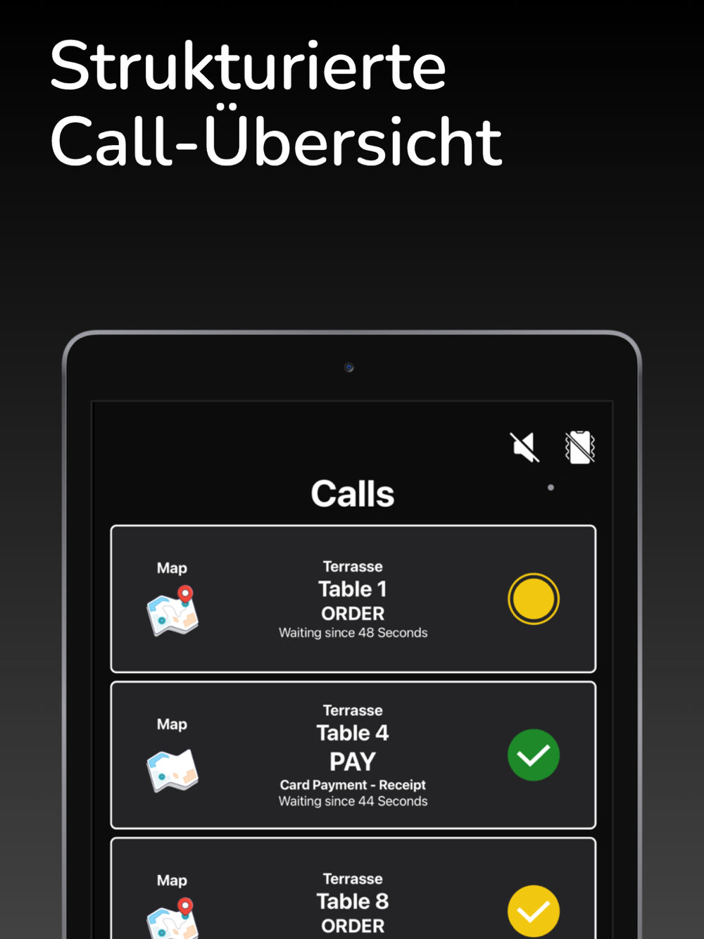 Für deine Kellner bietet die App eine benutzerfreundliche Oberfläche, auf der sie sofort sehen können, von welchem Tisch ein Aufruf kommt. Ein visueller Tischplaner zeigt den genauen Standort jedes Tisches an, um eine schnelle Reaktion zu ermöglichen. Das verbessert die Effizienz des gesamten Serviceablaufs erheblich.