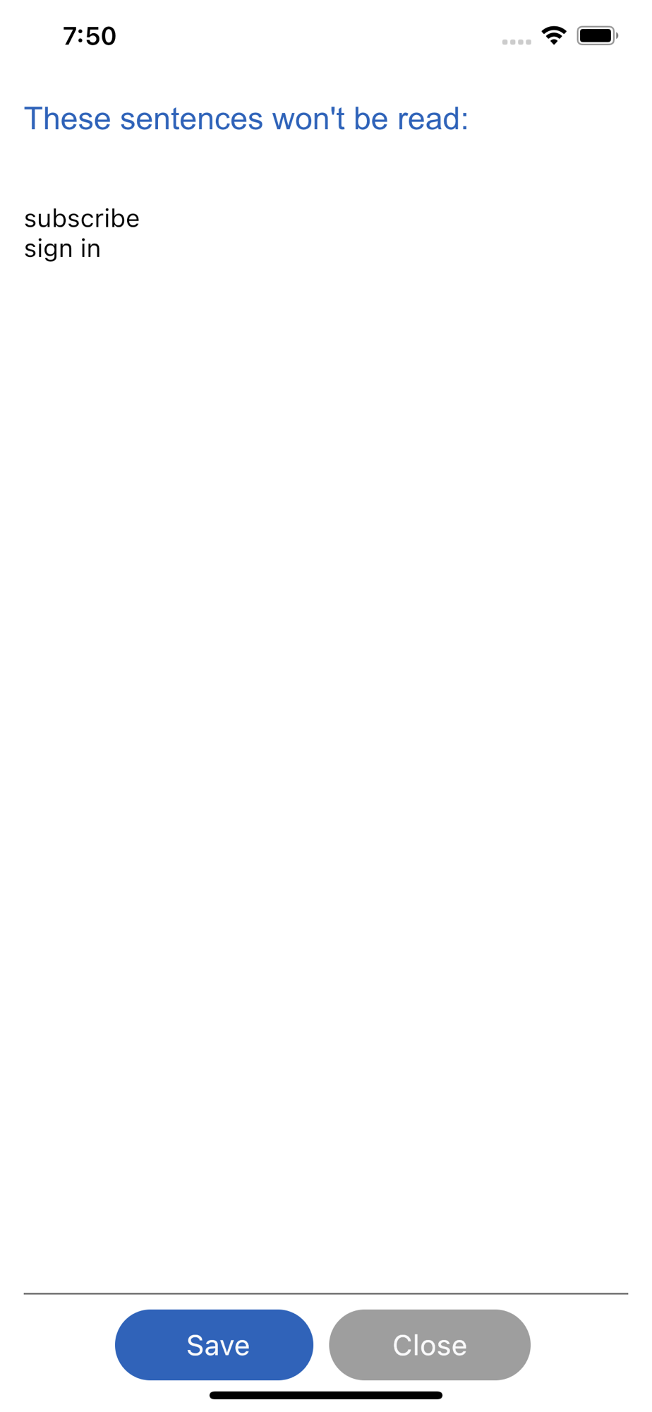 - Skipped sentences: there are some (a lot) sentences that you don't want the app to read aloud (even app is really smart to auto skip reading them :) ), so just add those sentences to skipped list to skip reading.