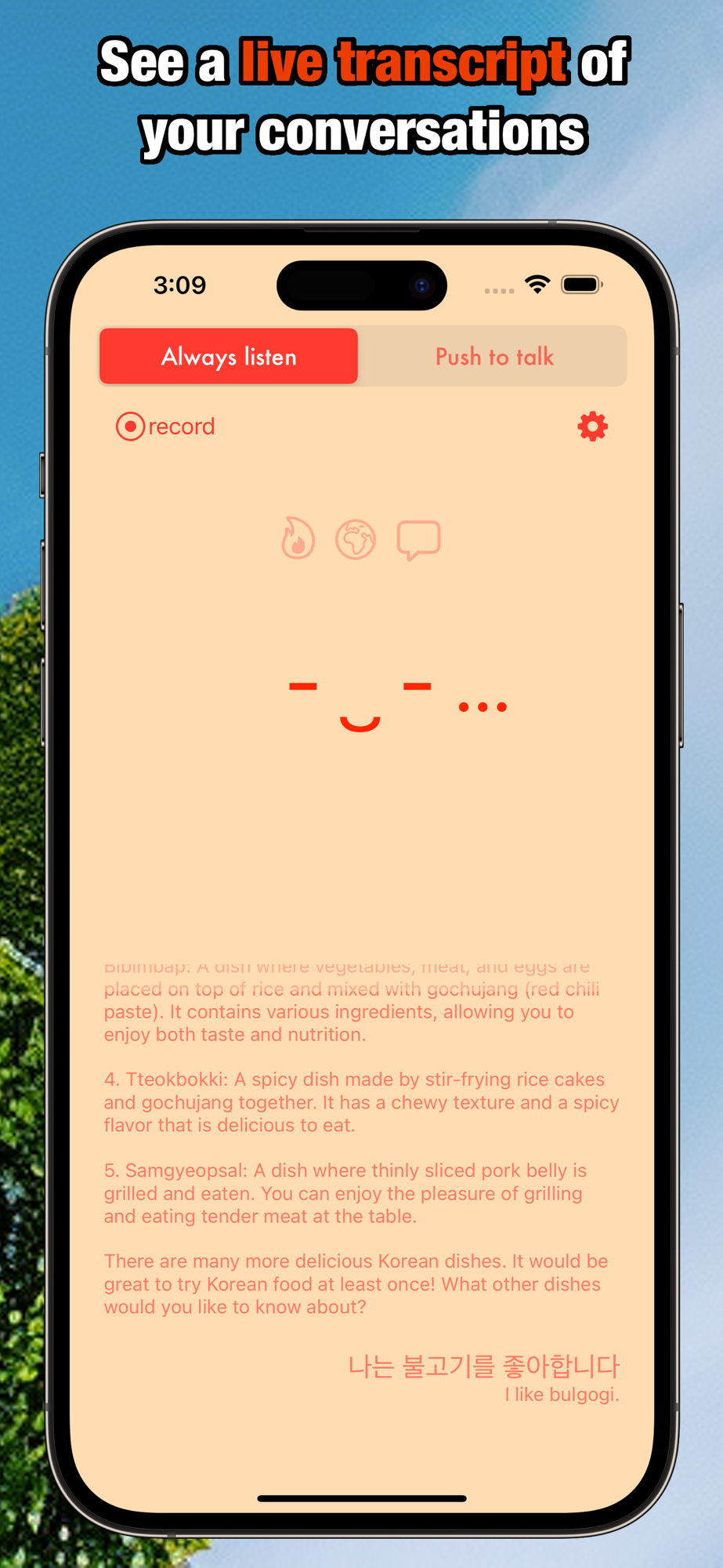 "Practice Korean with Sheila" goes above and beyond by offering you a seamless learning experience. The app provides a handy transcript of your conversations, allowing you to review and analyze your progress at any time. What's more, Sheila's capabilities extend beyond comprehension - she can even provide live English translations for anything you or she says, making it easier for you to grasp the nuances of the Korean language in real-time.