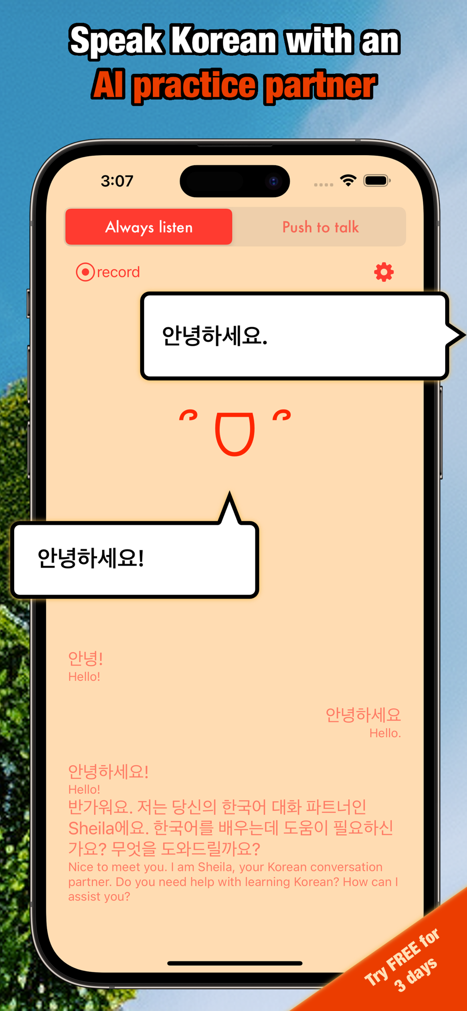 Don't miss out on this incredible opportunity to immerse yourself in a conversational Korean learning experience unlike any other. Download "Practice Korean with Sheila" today and embark on an exciting language journey right from the palm of your hand! Start speaking Korean with confidence and fluency, and unlock a world of new possibilities. 같이 한국어 연습해요!