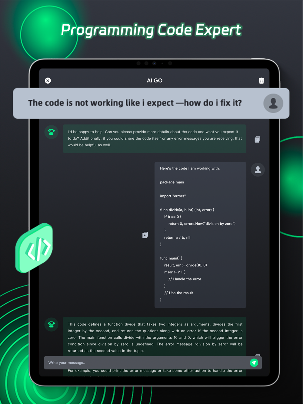 Say goodbye to the hassle of debugging and error-prone programming code! With the power of AI, you can effortlessly write and check any programming code with ease. Whether you're a seasoned developer or just starting out, ask the AI for advanced algorithms and machine learning technology to help you write clean, efficient, and error-free code. It can also quickly and easily identify potential bugs and errors, saving you time and frustration.