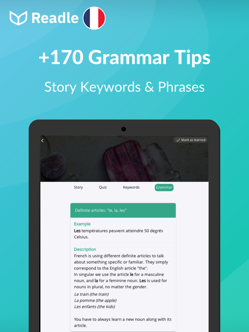 Readle is the best companion for your language learning education & upcoming language learning tests to get ahead. Download Readle and start to learn French!