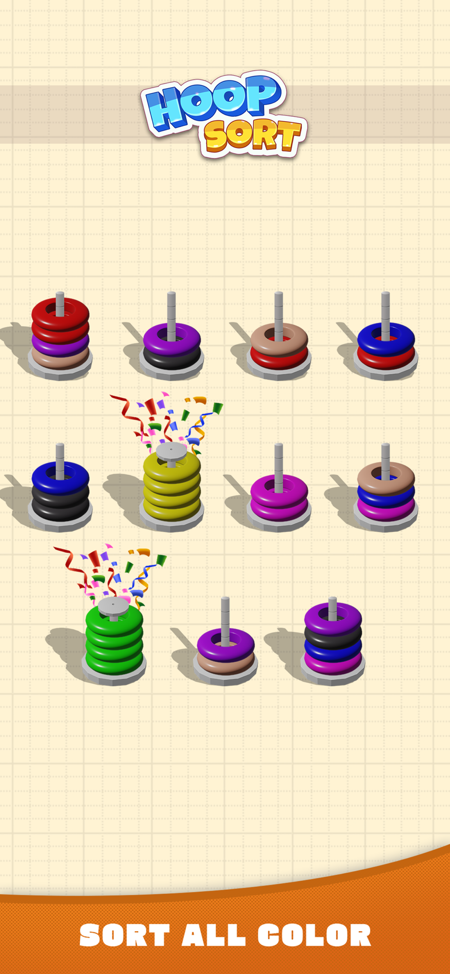 Sort the same rings in the stacks until 4 hoops with the same color are in same stack.